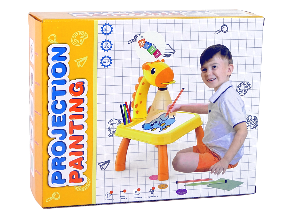Na podstawie można bezpośrednio malować mazakami, rysunki zmazujemy ściereczką, która również jest w zestawie. Można również skierować projektor na ścianę i wyświetlać na ścianie slajdy. Projektor może również pełnić funkcję lampki. Dzięki stolikowi dziecko będzie miało zabawę na długie godziny, ćwicząc koncentracje, wyobraźnię, cierpliwość i zdolności manualne!