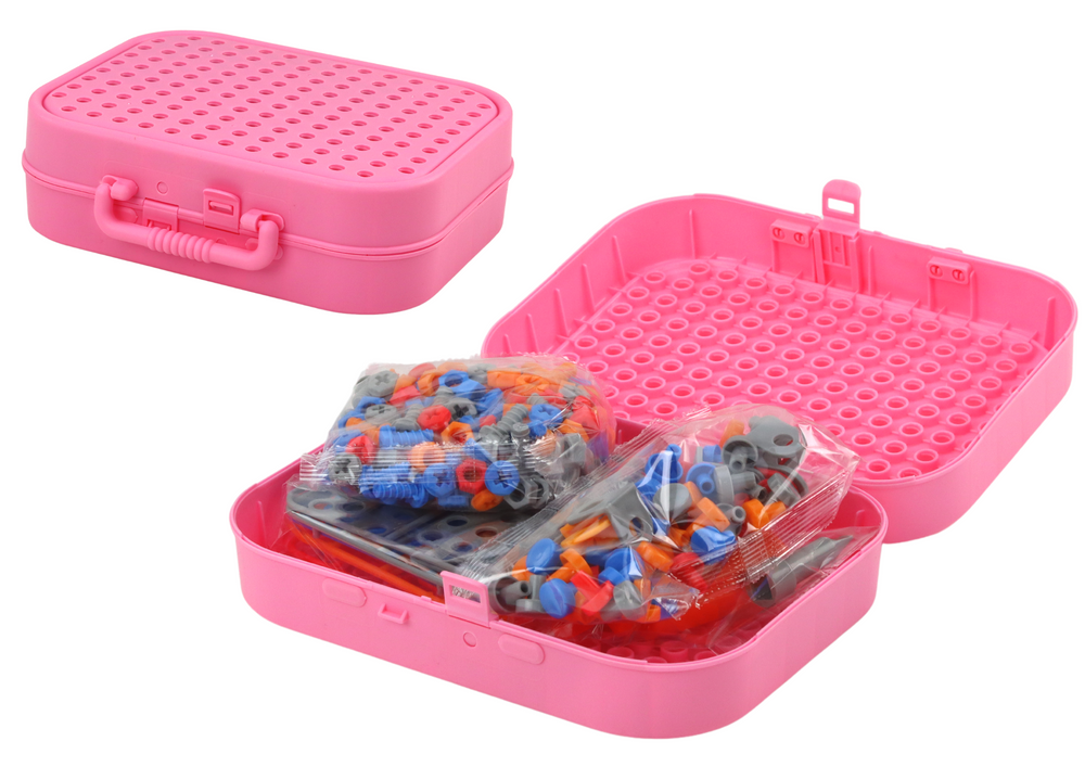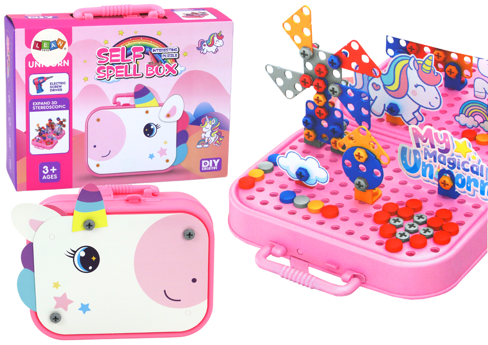 Stolik DIY ma kolor różowy, co nadaje mu magicznego wyglądu pasującego do motywu jednorożca, a figury geometryczne i śrubki występują w kolorach pomarańczowym, szarym, niebieskim i czerwonym, dodając różnorodności i atrakcyjności do zabawy.