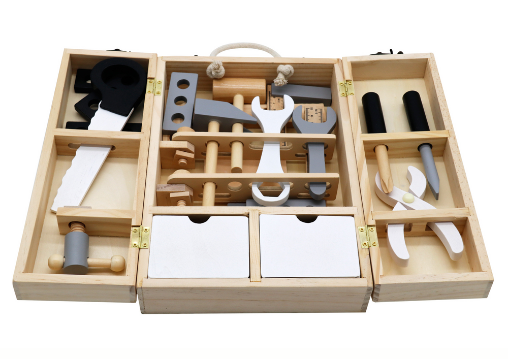 Zabawka jest łatwa w przenoszeniu, można ją również zawiesić na stanie, dzięki uchwytowi na sznurku. Klasyczne drewno oraz jego wytrzymałość sprawiają, że od zawsze cieszy się ono ogromnym uznaniem. Surowiec ten wygląda dobrze zarówno w naturalnym kolorze, jak i pomalowany. W tym przypadku pomalowany jest na szary, czarny i biały. Wewnątrz skrzynki znajdują się odpowiednie szufladki i przegrody, dzięki czemu narzędzia będą poukładane i na swoim miejscu. Można je zabrać również ze sobą, gdzie wspólnie z rówieśnikami możesz naprawiać lub rozkręcać zabawki. Cała walizka jest zamykana na klamry.