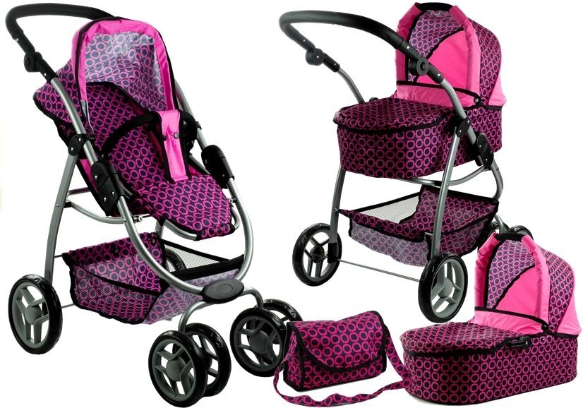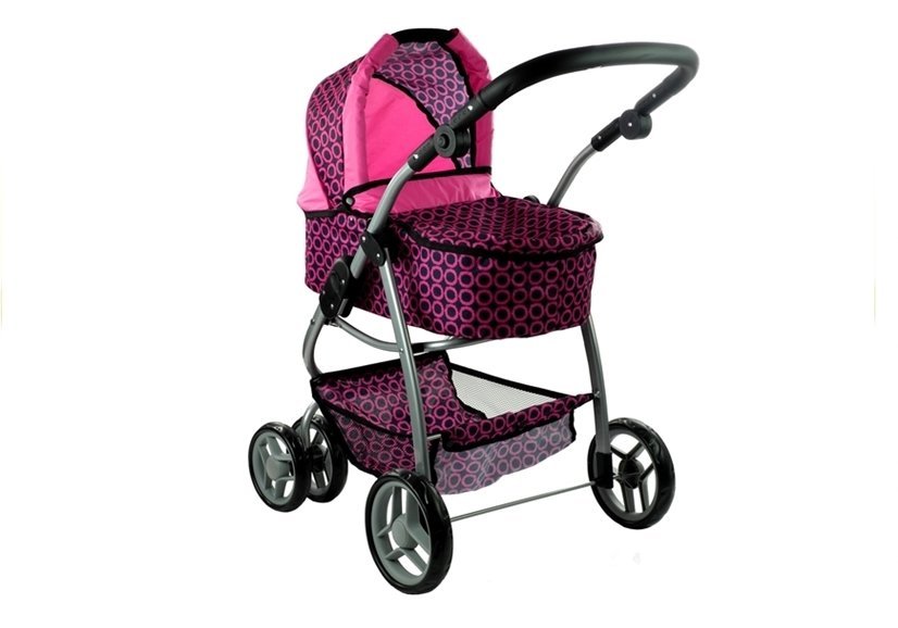 Czarny wózeczek przełamany różowymi detalami może być zarówno sportowym, spacerowym wózkiem, jak i klasycznym modelem z gondolą. Zmiana wariantu dziecięcego wózka w dużym stopniu urozmaica zabawę, dając dziewczynkom wiele sposobów na przyjemną zabawę. Zamiana wariantów polega na przełożeniu głównego elementu wózka, co sprawia, że wózek wygląda jak zupełnie inna zabawka. Wytrzymała i solidna konstrukcja została wykonana z aluminiowych rurek o srebrnym odcieniu, co fantastycznie komponuje się z poszyciem wózka z najwyższej jakości materiału. Różowo-czarne pokrycie wózeczka odznacza się właściwościami gwarantującymi trwałość i długą żywotność — w razie potrzeby odpinane elementy można prać ręcznie lub czyścić wilgotną ściereczką, w celu utrzymania wysokiej higieny przedmiotu.