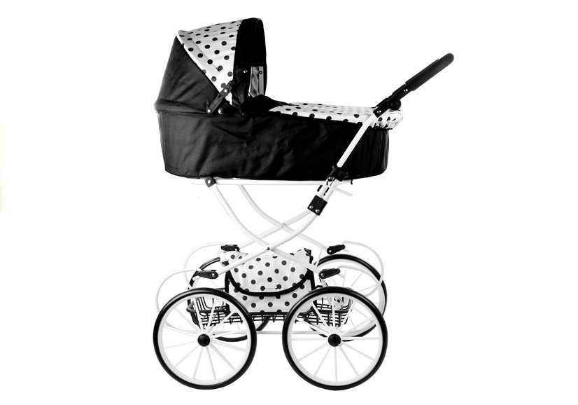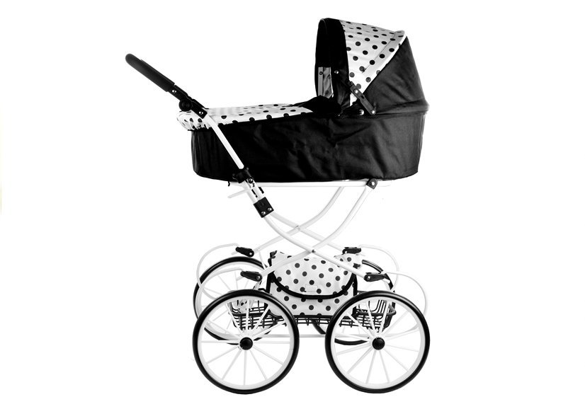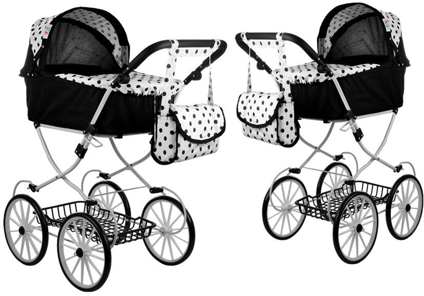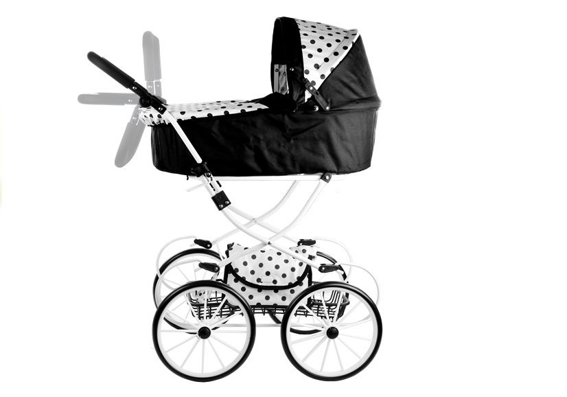 Głęboki wózek retro dla lalek Alice — czarno-biały w groszki