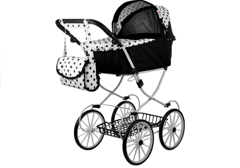 Czarno-biały retro wózek posiada ozdobny detal, jakim są groszkami w kontrastującym kolorze, umieszczone między innymi na daszku, pokrywie gondoli czy torbie — co dodaje mu dużego uroku. Retro wózeczek z pewnością zainteresuje i zachęci do zabawy każdą małą opiekunkę — gwarantują to wymiary dopasowane do przeciętnego wzrostu kilkuletnich dziewczynek, a także wzornictwo inspirowane budową prawdziwych wózków dla dzieci. Co istotne — prezentowany retro model może rosnąć razem z dzieckiem, ponieważ posiada rączkę z możliwością regulowania jej wysokości. Wózek będzie odpowiedni dla wszystkich lalek i zabawek o maksymalnej długości 69 cm — duże wymiary gondoli z łatwością pomieszczą kilku zabawkowych pasażerów.