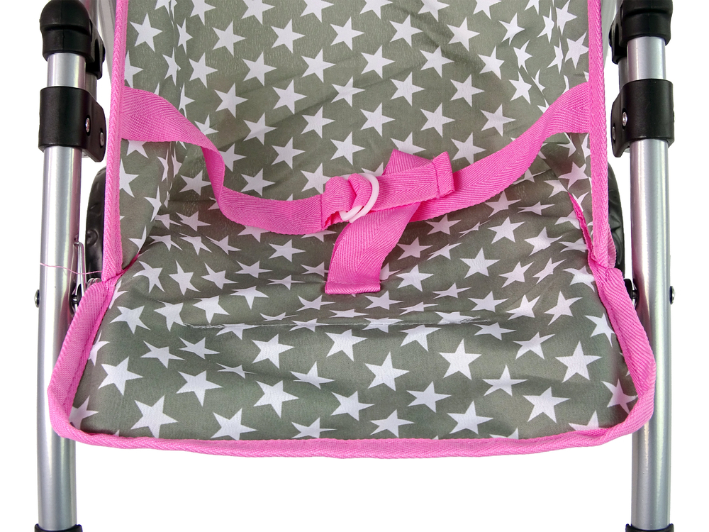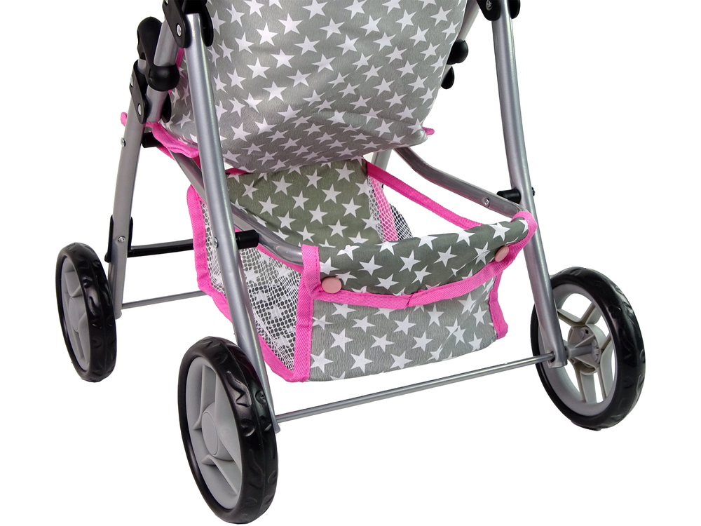 Wózek wyposażony jest w cztery koła umożliwiające łatwe prowadzenie go nawet po nierównych nawierzchniach. Kolor szary kolor w białe gwiazdki, różową oblamówką zachęci dziewczynkę do zabawy. Pod siedziskiem znajduje się mały schowek na drobne rzeczy i te potrzebne dla lalki oraz dla Twojego dziecka. Dodatkowym atutem jest to, że jest składany, bez problemu zmieści się do auta i będzie można zabrać go na wspólną rodzinną wycieczkę.
