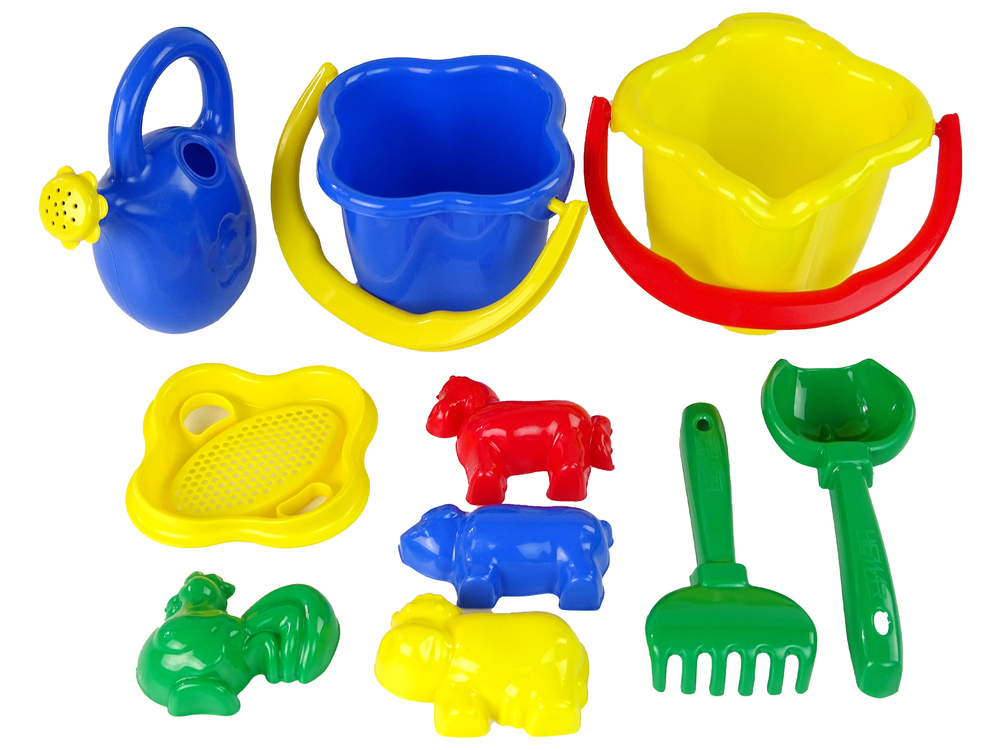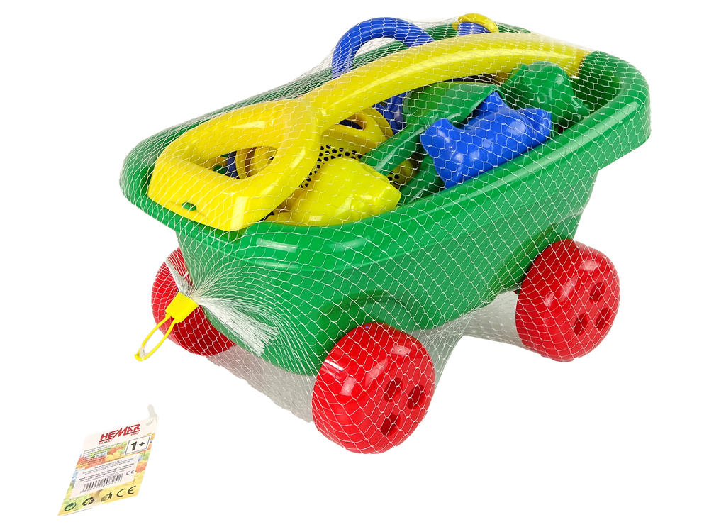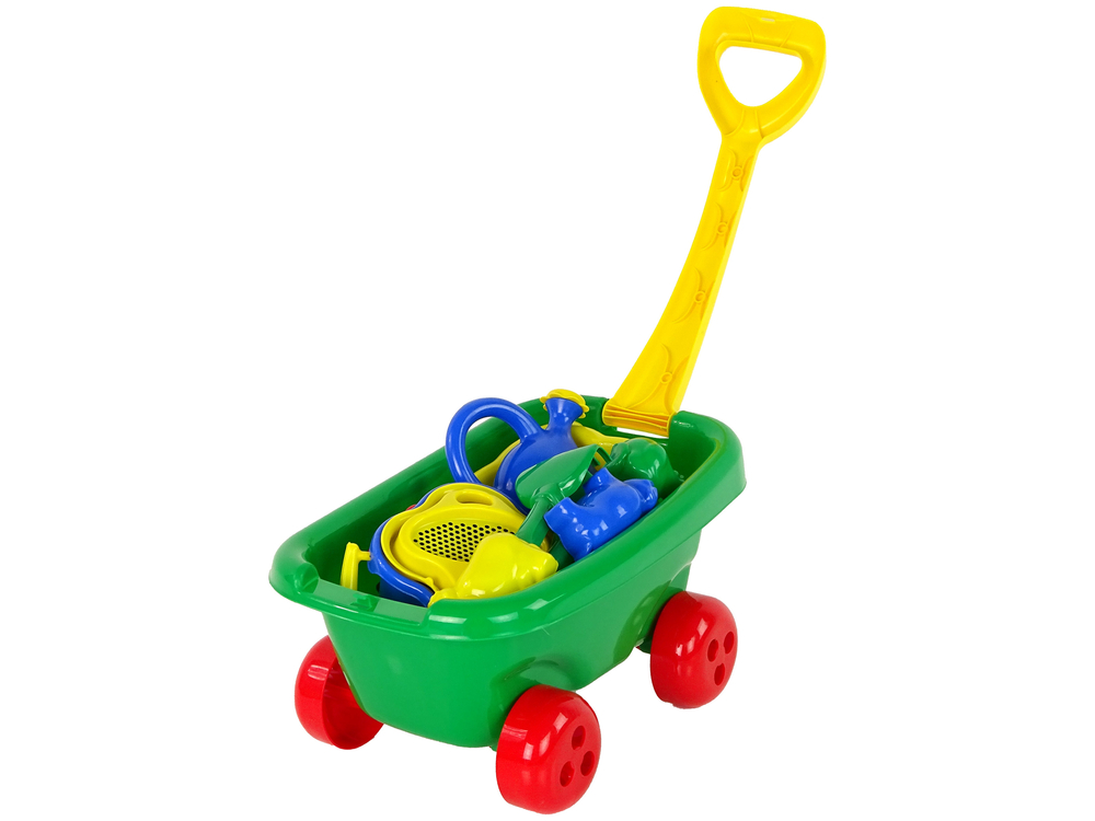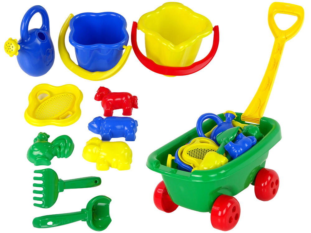 Stylowy wózek z zestawem do piasku zapewni dzieciom rozrywkę podczas zabawy w piasku. W skład zestawu wchodzi wózek, dwa wiaderka, łopatka, grabkami, konewka, 4 foremki. Wózek występuje w 3 kolorach.