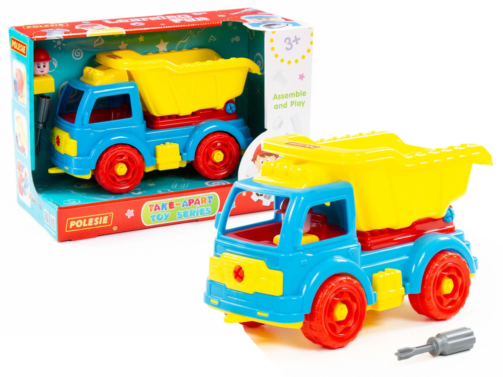 W zestawie dołączony jest śrubokręt, dzięki któremu będzie mógł rozpocząć majsterkowanie. Możliwość rozkręcania i skręcenia wzmocni u niego precyzje i rozwinie zdolności manualne. Do przestronnej kabiny wywrotki dziecko może włożyć figurkę budowlańca, dołączoną do zestawu. W kontenerze maluch może umieścić naprawdę wiele skarbów i przewozić je na swój własny plac budowy. Wywrotka jest podnoszona, przez co w prosty sposób opróżnić.