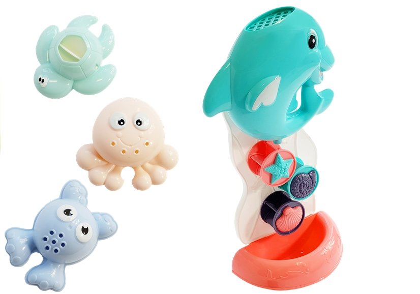 Delfin działa na zasadzie wodospadu, wystarczy napełnić od góry wodą i spływająca z góry woda będzie wprawiać w ruch kółka z muszelkami co przykuje uwagę dziecka. Dodatkowo dołączono 3 zwierzęta morskie , które unoszą się na tafli wody i pływają wokół twojego dziecka, wywołując uśmiech na jego twarzy.