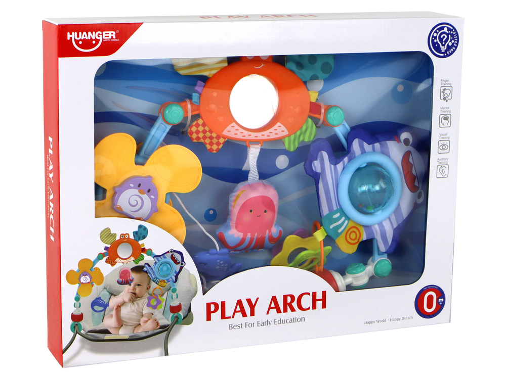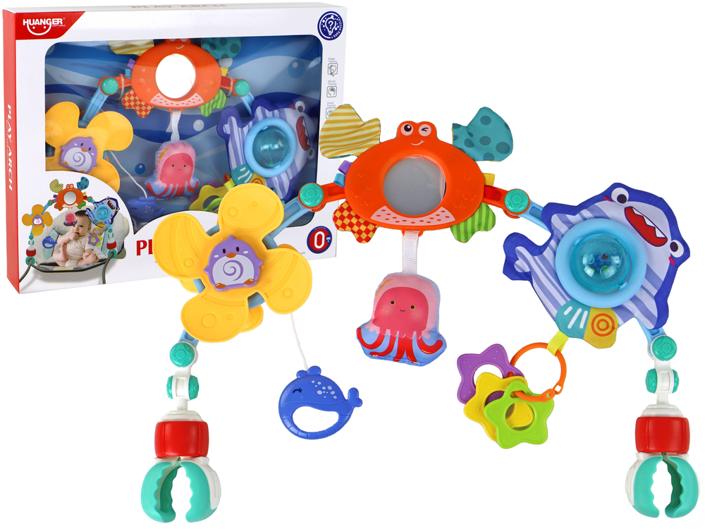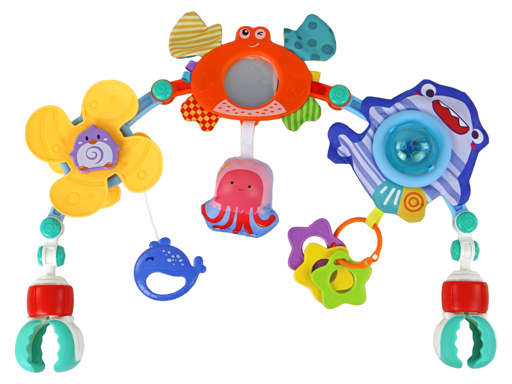 Żółty wiatraczek z fioletowym pingwinkiem obraca się delikatnie, co przyciąga uwagę dziecka i dostarcza mu wrażeń wizualnych. Mały pingwinek na wiatraczku doda uroku i uśmiechu na twarzy maluszka. Pomarańczowy krab z szeleszczącym elementem i lusterkiem, który dostarcza dźwięków i stymuluje słuch dziecka. Dodatkowo, lusterko pozwala maluchowi odkrywać swoje odbicie i rozwijać zdolności obserwacyjne. Niebieski rekin z obrotową grzechotką to nie tylko urocza ozdoba, ale także zabawka sensoryczna. Obracająca się grzechotka rozwija zdolności motoryczne dziecka i dostarcza mu przyjemnych dźwięków podczas zabawy.