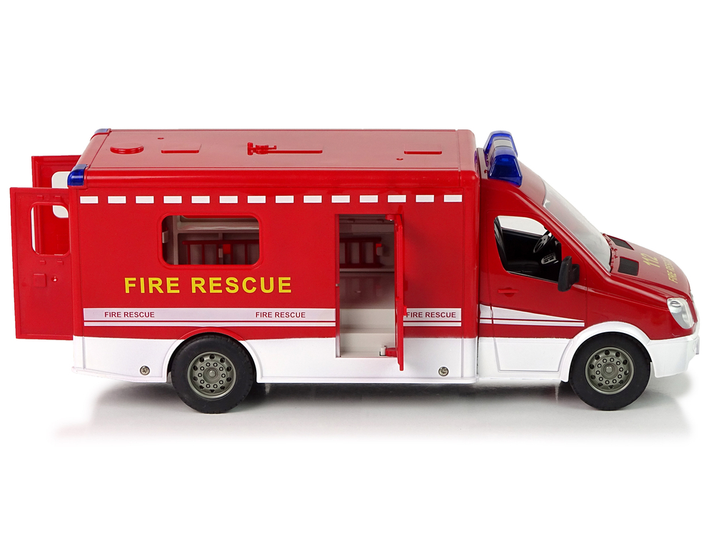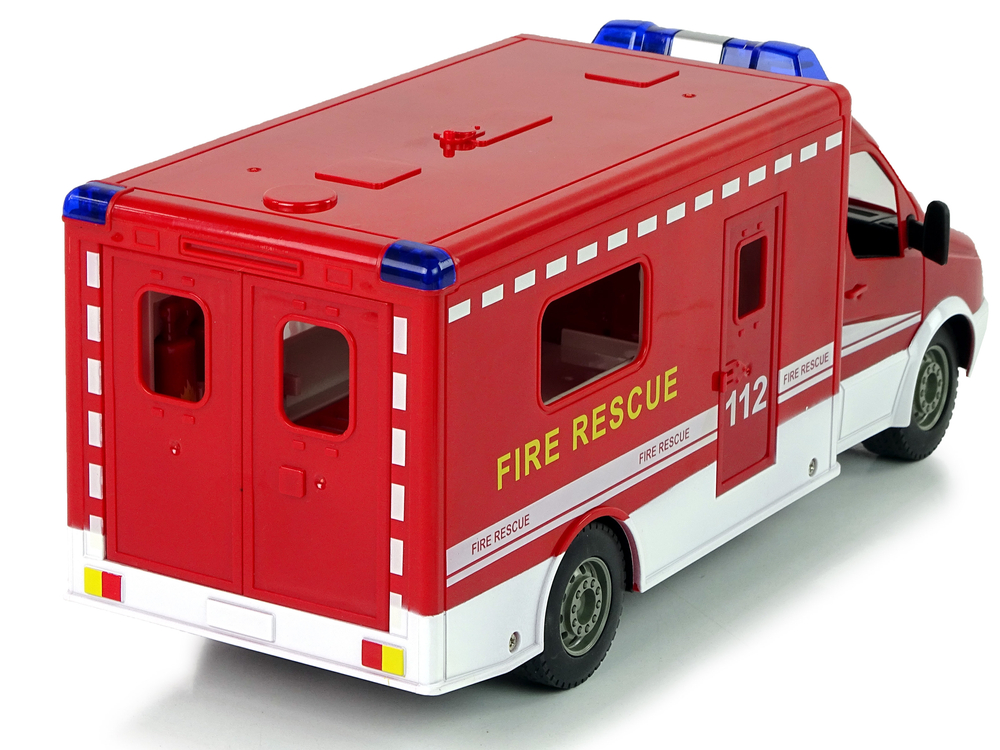 Czerwony wóz strażacki pozwala dziecku poczuć się jak prawdziwy strażak. Wewnątrz po otworzeniu znajduje się w pełni wyposażona naczepa straży pożarnej z dwoma gaśnicami i małą drabiną. Pilot ma częstotliwość 2.4 Ghz. Obsługa pilota R/C jest bardzo prosta, a pilot wygodnie układa się w dłoni. Z jego pomocą operator wozu może kierować nim, zmieniając kierunki jazdy na przód/tył i prawo/lewo. Uruchamiać dodatkowe funkcje, które zaskoczą malucha.