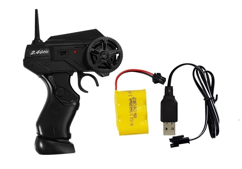 Pilot dołączony do wyścigowego zestawu odbiera na częstotliwości 2,4G co redukuje wszelkie zakłócenia podczas zabawy. Wyposażony jest w pokrętło i przycisk, odpowiadające za sterowanie przód — tył oraz prawo — lewo. Zielona obudowa sportowego auta składa się z wielu graficznych naklejek, co tylko podnosi poziom realnego odwzorowania zabawki.