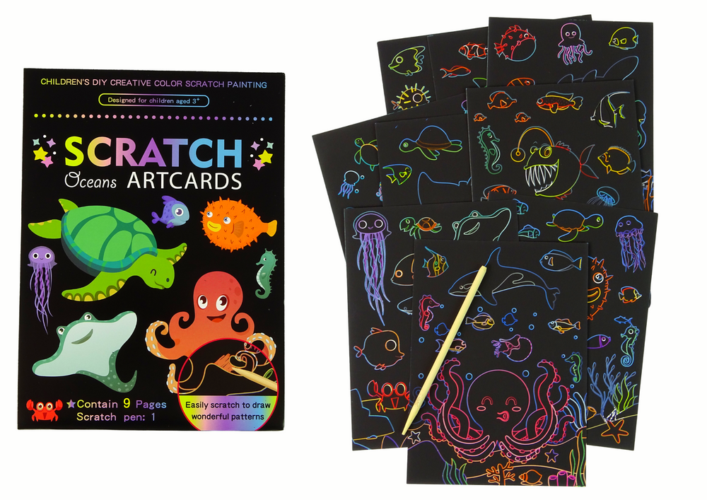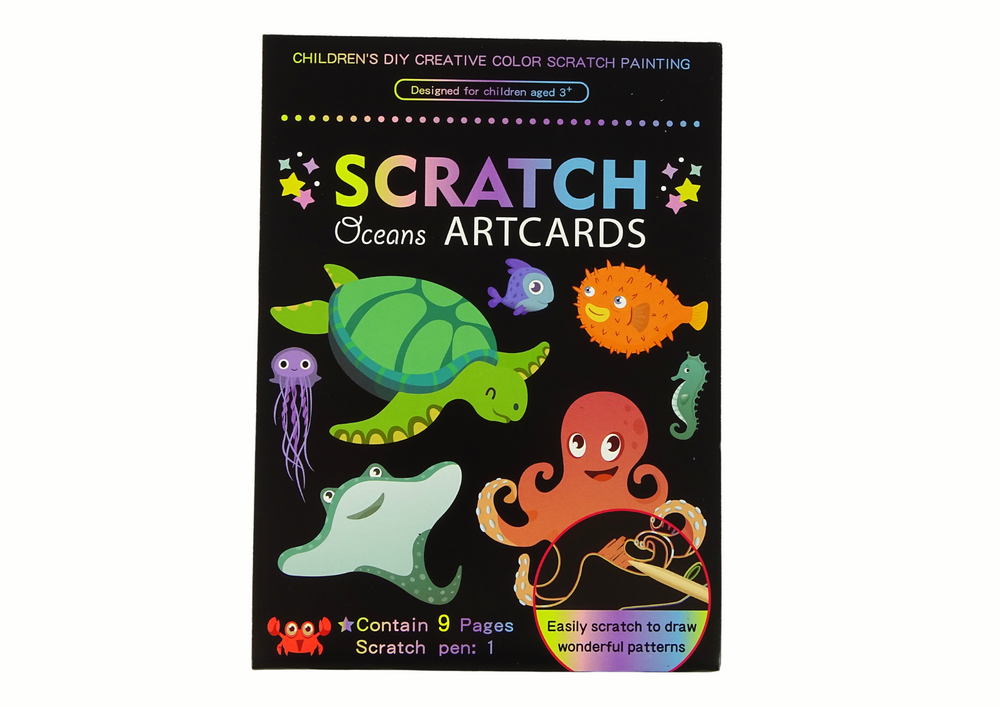 W zestawie znajdziesz 9 obrazków do zdrapywania, które ożywiają się przed oczami dziecka. Zabawa jest prosta: używając specjalnego drewnianego patyczka, można zdrapywać czarną warstwę na obrazku, odkrywając piękne i kolorowe ilustracje. Te ilustracje przedstawiają różne sceny z podwodnego świata.