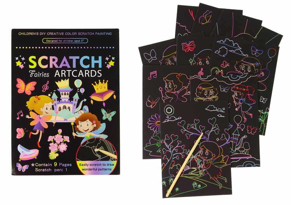 W zestawie znajdziesz 9 obrazków do zdrapywania, które ożywiają się przed oczami dziecka. Zabawa jest prosta: używając specjalnego drewnianego patyczka, można zdrapywać czarną warstwę na obrazku, odkrywając piękne i kolorowe ilustracje. Te ilustracje przedstawiają różnorodne sceny ze świata wróżek.