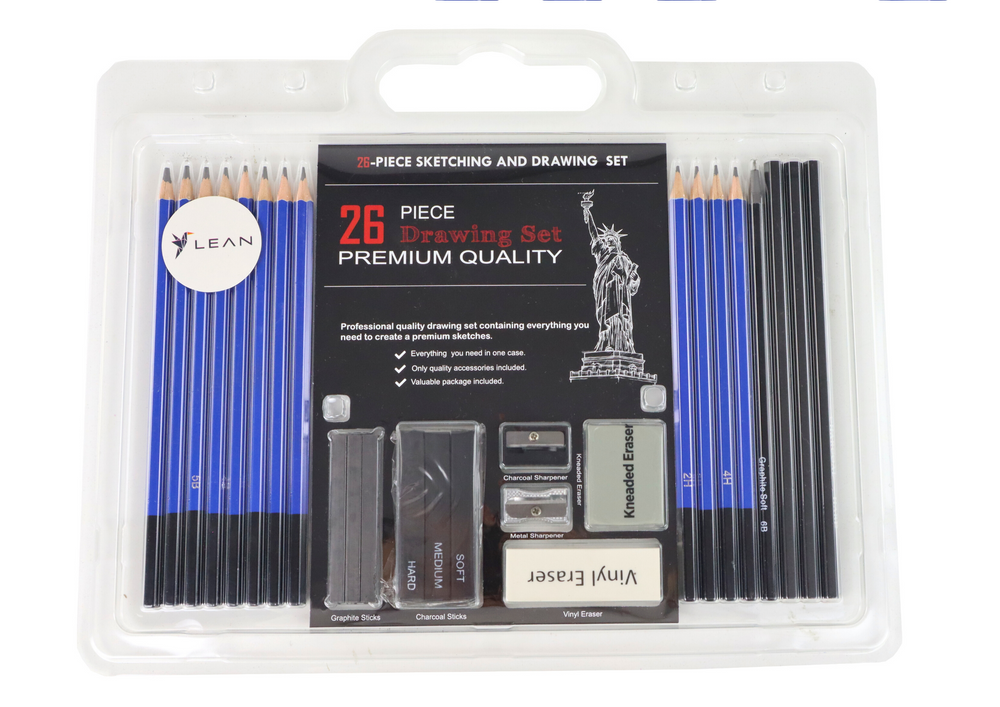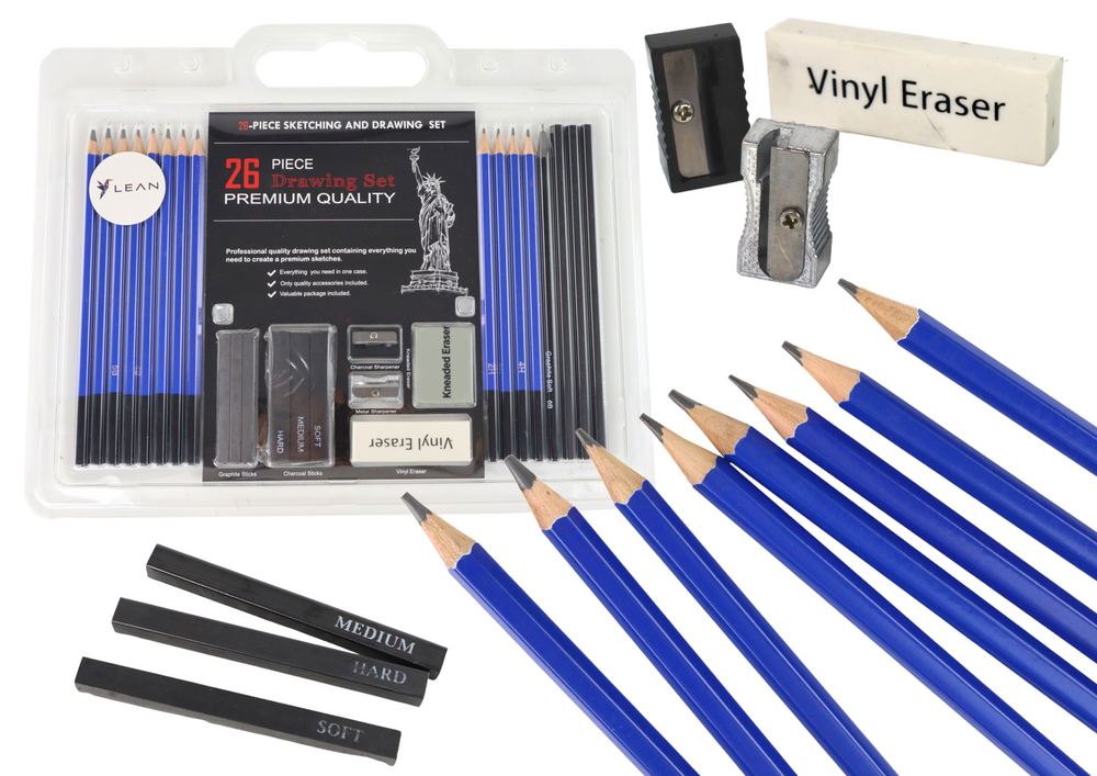 Zestaw Artystyczny Do Szkicowania i Rysowania 26 El. to niezbędny sprzęt dla każdego miłośnika sztuki. Obejmuje aż 12 różnych ołówków, w tym od bardzo miękkich po twarde (5H, 4H, 3H, 2H, HB, B, 2B, 3B, 4B, 5B, 6B, 8B). Dodatkowo, w zestawie znajdują się 3 ołówki węglowe o różnym stopniu miękkości, 3 węglowe pałeczki, 3 grafitowe pałeczki (miękkie 4B, średnie 2B, twarde 6B), a także metalowa i plastikowa strugaczka, bezdrzewny ołówek oraz 2 gumki do mazania.