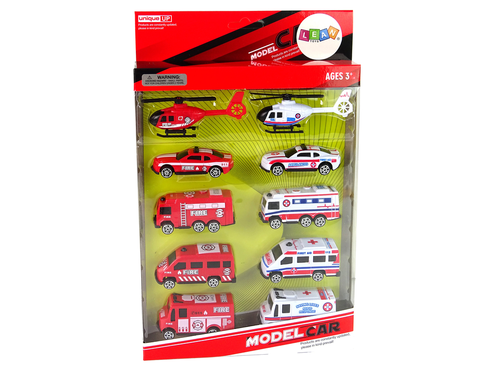 W zestawie znajdują się 10 różnych pojazdów przedstawiających pojazdy służb ratowniczych. Wszystkie modele zostały wykonane z plastiku, na karoserii posiadają charakterystyczne naklejki sugerujące przeznaczenie pojazdu.