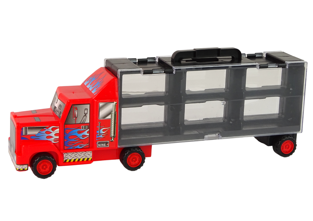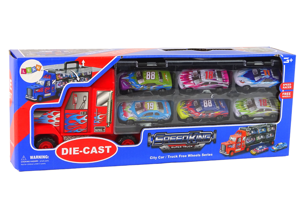Zestaw składa się z dużej plastikowej ciężarówki z miejscami parkingowymi dla małych wozów sportowych. Pojazdy te idealnie mieszczą się w dłoni, a karoseria ma niesamowite kolory i wyścigowe naklejki. Wykonane są z plastiku, dzięki czemu są lekkie, bezpieczne oraz trwałe. Dużą ciężarówką może przetransportować je na miejsce super wyścigu.