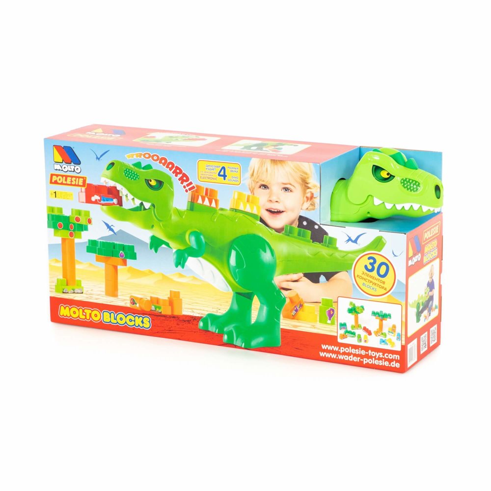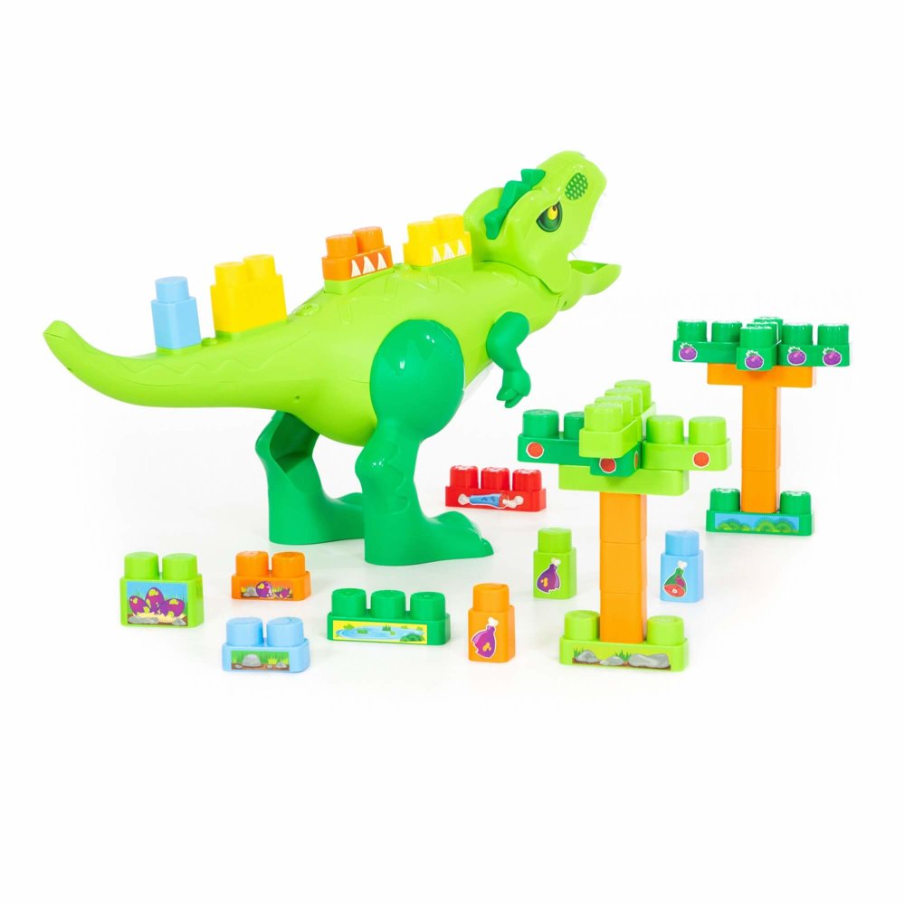 Kończyny dinozaura poruszają się, a pysk otwiera przez których pożera wszystkie klocki. Na grzbiecie i ogonie dinozaura znajdują się miejsca do przymocowania klocków. W ten sposób dziecko może samodzielnie uzupełniać wygląd zabawki.