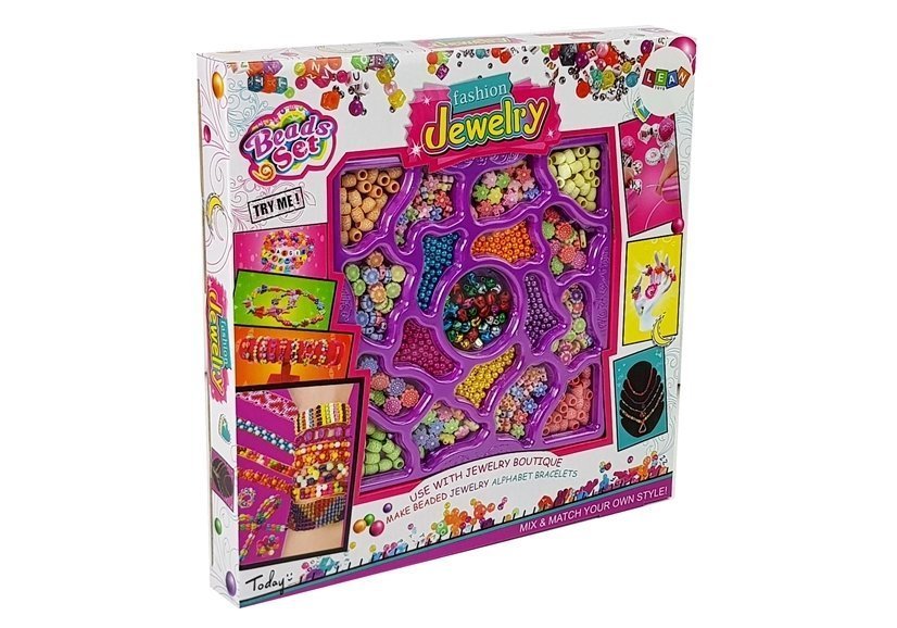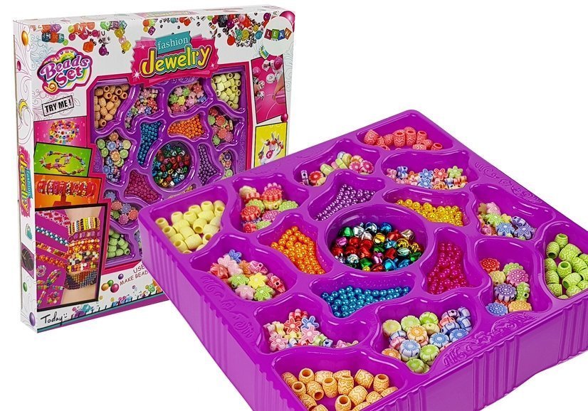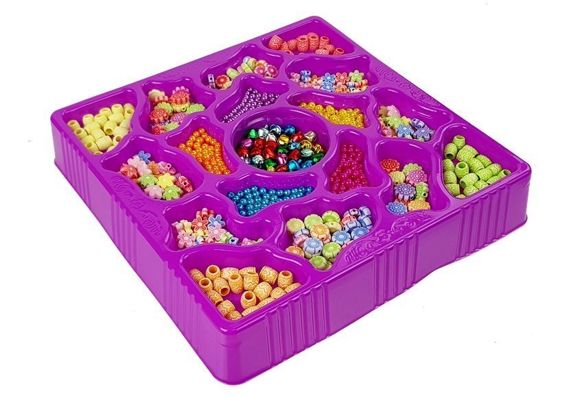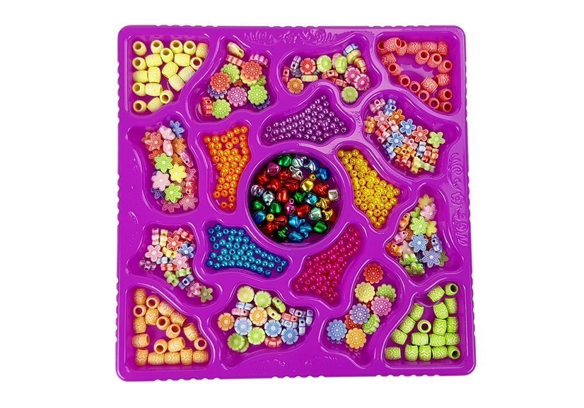 Zestaw składa się z 18 różnych elementów, części do biżuterii. Wybór jest ogromny, w różnych kolorach i wzorach, kwiatki, kuleczki. Do zestawu dołączone są sznurki w kolorze czerwonym, zielonym i białym. . Dziewczynka będzie mogła stworzyć swoją wymarzoną bransoletkę lub wisiorek! A kto wie może sprawi najcenniejszy prezent mamie lub babci? Wykonaną od serca biżuterią.