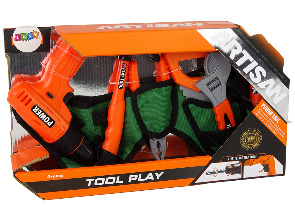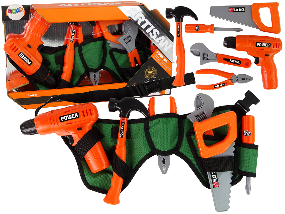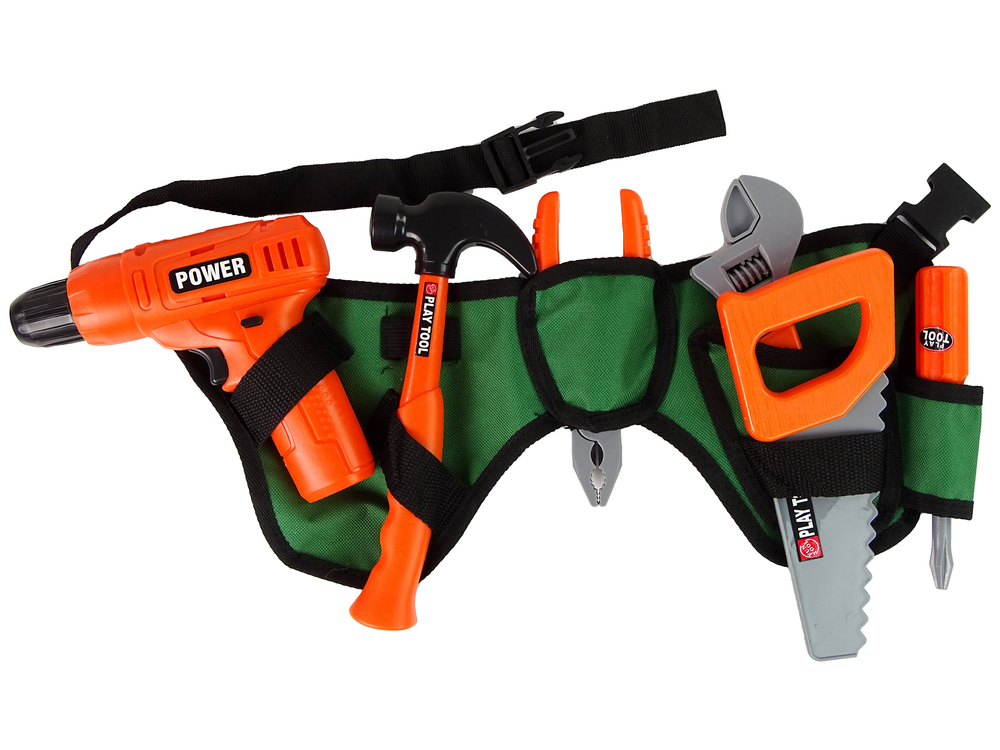 Pas posiada wiele przegródek, które pomieszczą wszystkie najpotrzebniejsze przedmioty, zapinany na klamrę. Wkrętarka jest idealnie wyprofilowana dla małych rączek, dzięki czemu łatwo ją utrzymać i wykonywać różnego rodzaju prace. Wszystkie elementy zestawu zostały idealnie odwzorowane i uzupełniają się, aby dać pełne możliwości rozwoju dziecka w zapoznaniu się z wszystkimi narzędziami, jak je używać i co dzięki nim zrobimy. Wszystko wykonane w kolorystyce pomarańczowo- szarej.