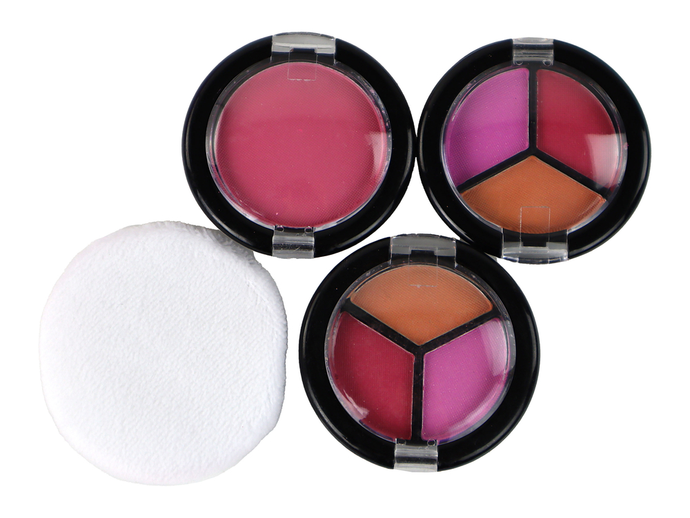 – Cienie w odcieniach różu, fioletu, niebieskiego oraz brokatowy srebrny i złoty