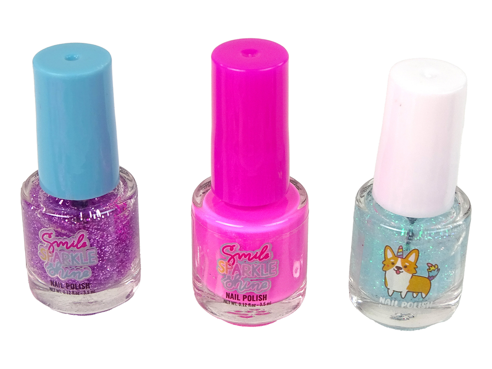 – 3 lakiery do paznokci: różowy, fioletowy brokatowy, turkusowy brokatowy