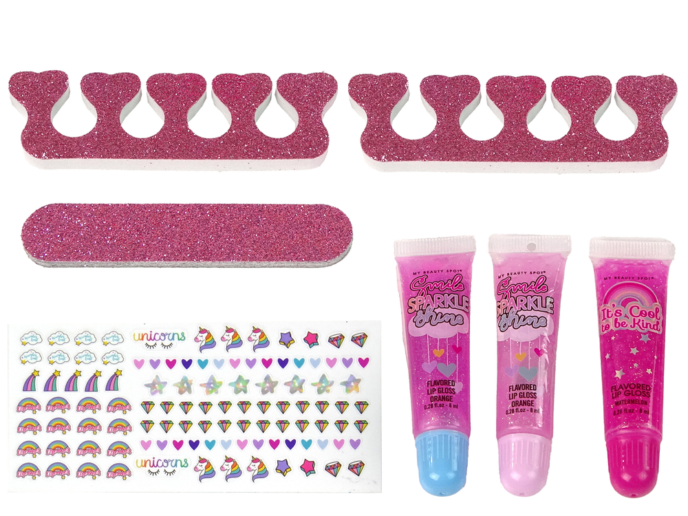 Po wyrównaniu długości i kształtu paznokci za pomocą pilnika nałóż na paznokcie wybrany kolor i naklejki. Klasyczne, wzorzyste i brokaty pozwolą Ci pomalować przepięknie paznokcie oraz szybko i bezinwazyjnie usunąć za pomocą zmywacza. Kolejną czynnością jest piękny makijaż- brokatowe cienie oraz błyszczyk w przepięknym kolorze różu.