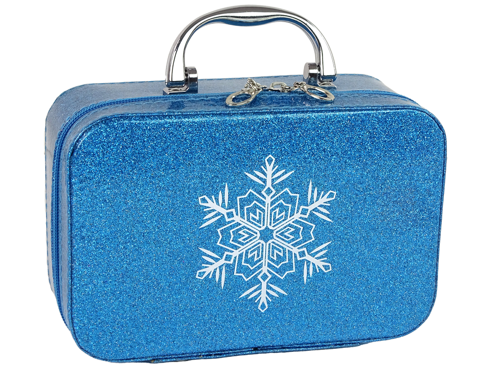 Całość znajduje się w pięknym, brokatowym kuferku ze srebrną rączką i gwiazdką w kształcie płatku śniegu. Sam kuferek jest bardzo elegancko i ciekawie wykonany. Można w nim przechowywać wszystkie swoje kosmetyki. W zestawie znajdziesz cienie do powiek, błyszczyki, szminki i do tego lusterko. Wystarczy zabrać ze sobą kuferek i masz wszystko co potrzebne, żeby móc stworzyć piękny makijaż oraz manicure.