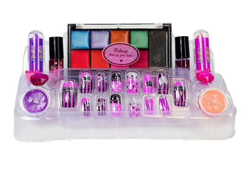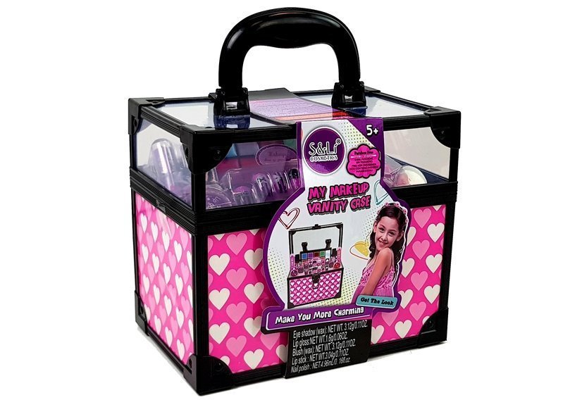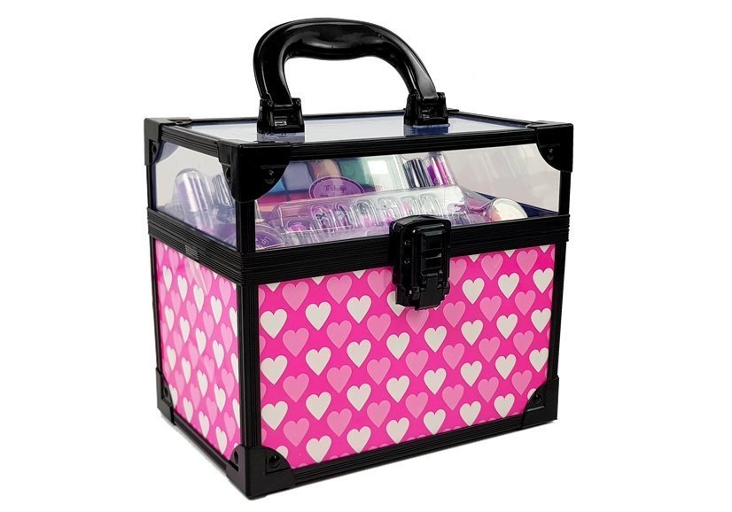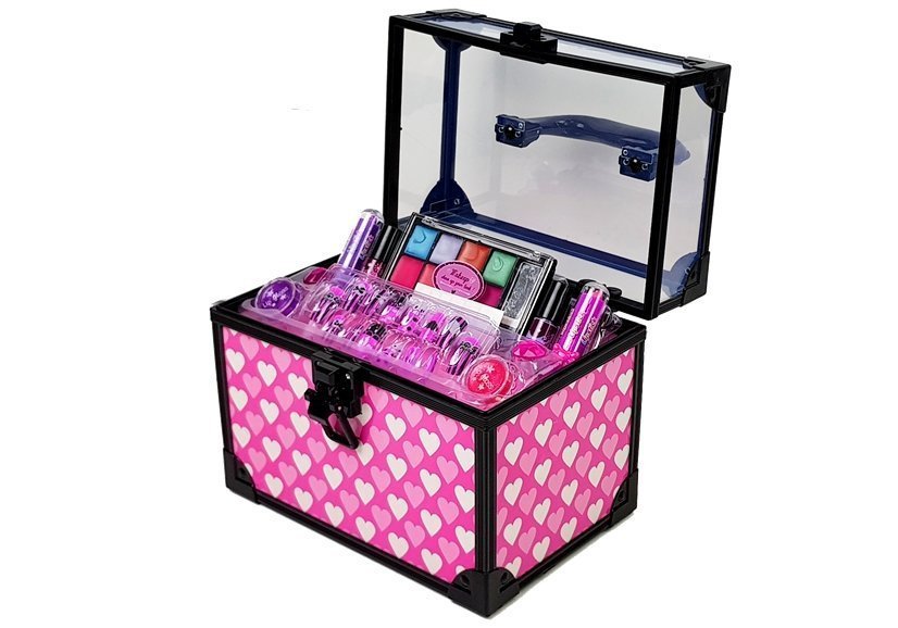 W zestawie znajdują się paznokcie, lakiery do paznokci, szminki oraz piękne pierścionki. To tylko nieliczne z kosmetyków, które zmieszczą się w szkatułce. Jej gabaryty pozwolą na pomieszczenie dużo więcej produktów do makijażu. Po nałożeniu lakieru na paznokcie należy poczekać kilka minut, aby wyschły. Modne kolory i wzory sztuczny paznokci pozwolą na stworzenie odlotowego manicure. Cienie do powiek oraz szminki stworzą piękny makijaż na wyjście z koleżankami. Duży kuferek na kosmetyki posiada rączkę, dzięki której możemy przenieść ją z miejsca na miejsce.