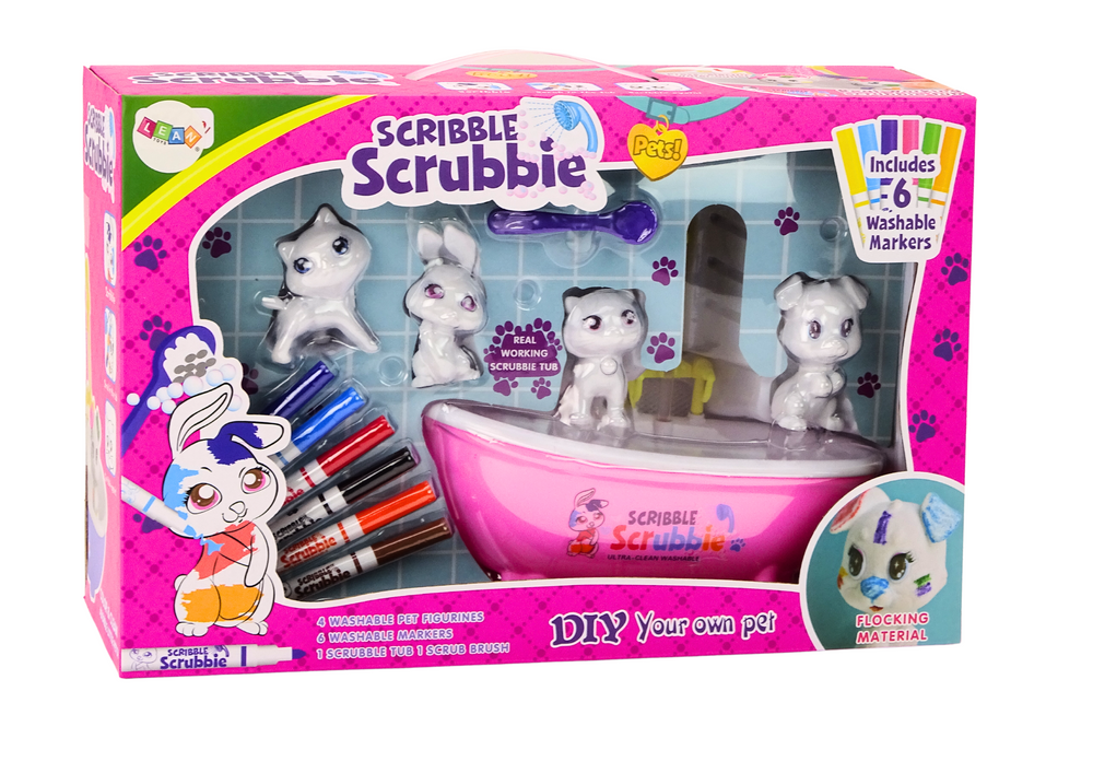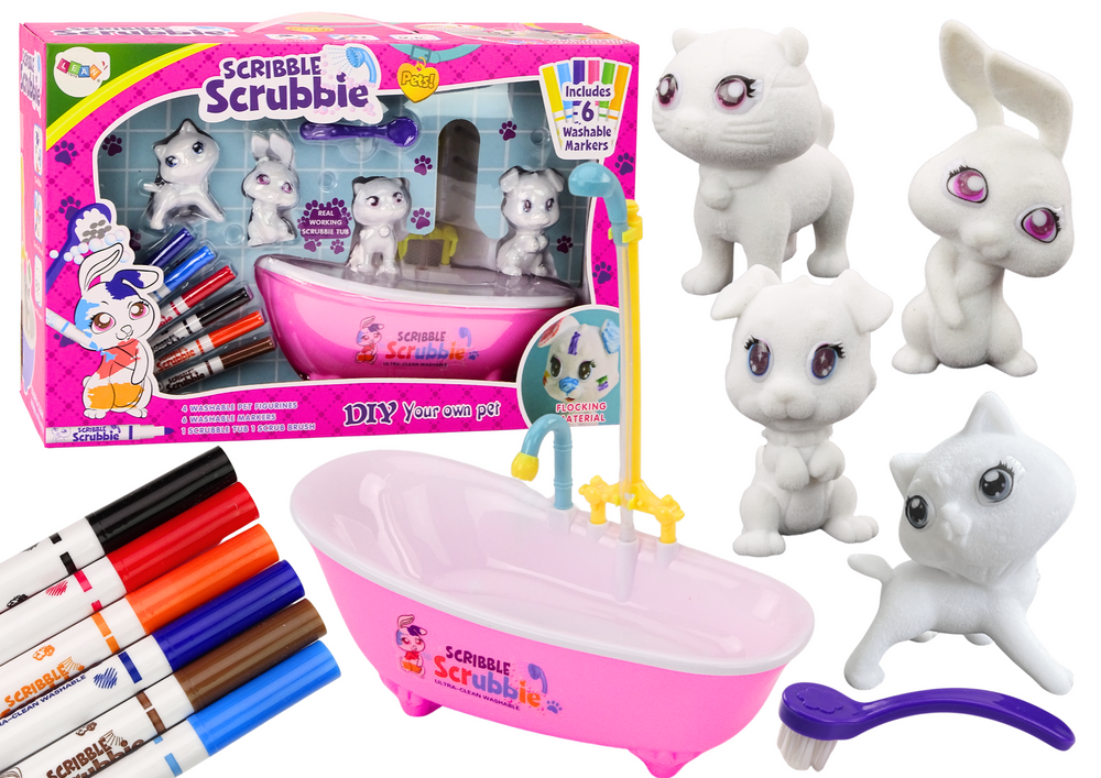 Wszystkie elementy zestawu są wykonane z wysokiej jakości, bezpiecznych dla dzieci materiałów. Figurki zwierzątek są trwałe i przystosowane do wielokrotnego malowania, a pisaki są nietoksyczne i łatwo zmywalne. Wanna i szczotka są zaprojektowane tak, aby ułatwić zmywanie farby, co sprawia, że cały proces jest prosty i przyjemny.