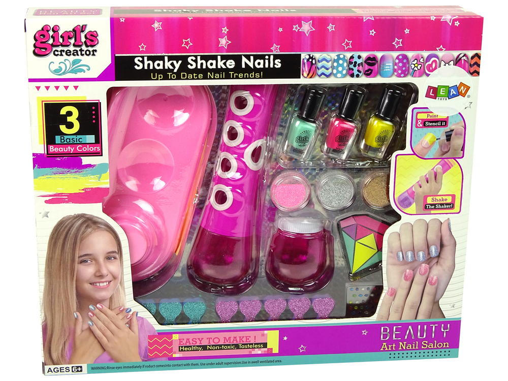 Przedstawiamy doskonałe rozwiązanie dla wszystkich mam, których córeczki podbierają im kosmetyki, a przede wszystkim upodobały sobie lakiery do paznokci — własny zestaw do manicure. Błyszczący, kolorowy komplet lakierów i błyskotek podbije serce wszystkich dziewczynek. Modne kolory i naklejki pozwolą na stworzenie odlotowego manicure, który można usunąć w szybki i nieinwazyjny sposób — działa na zasadzie naklejki. Czas na wspólny manicure! Zabawa nauczy Twoje dziecko precyzji, pozwoli pobudzić wyobraźnie oraz kreatywność.