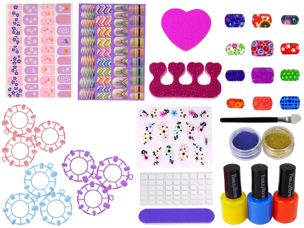 Wielokolorowy zestaw lakierów do paznokci i różnych, kolorowych naklejek. Klasyczne, wzorzyste i brokaty pozwolą Ci pomalować przepięknie paznokcie oraz szybko i bezinwazyjnie usunąć zwykłym zmywaczem do paznokci.