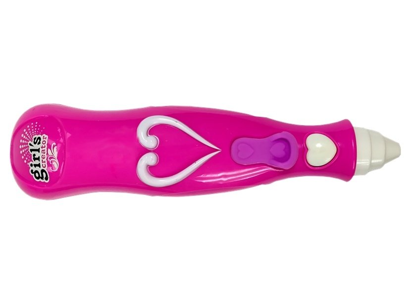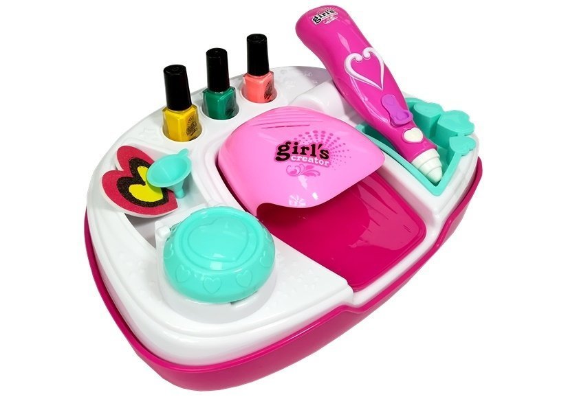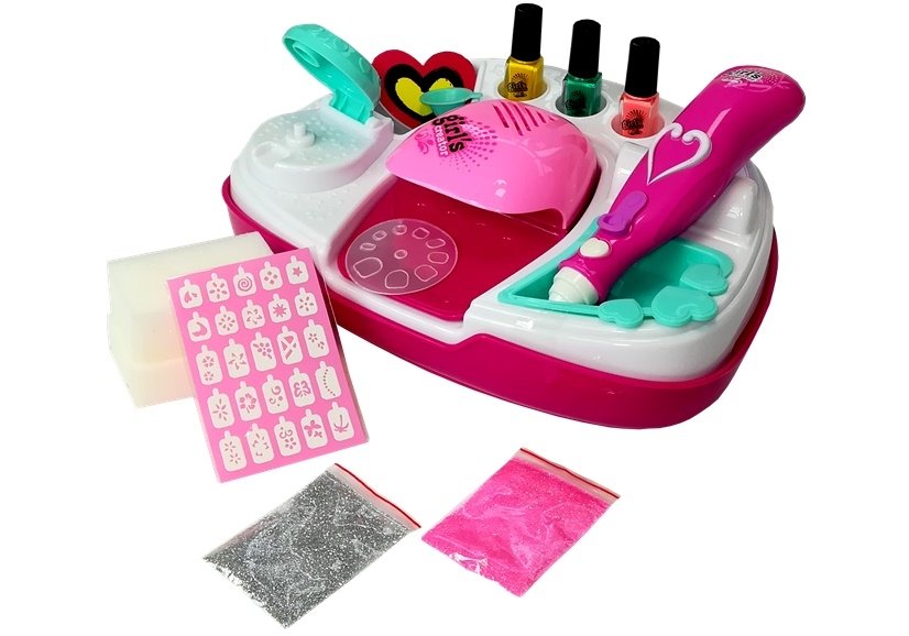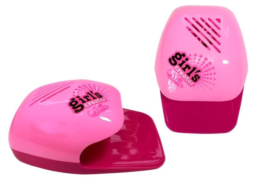 Zestaw do malowania paznokci z suszarką to prawdziwie innowacyjna zabawka. Lakiery, którymi dziecko będzie ozdabiało swoje paznokcie posiadają skład, dzięki któremu nie przylegają na stałe do płytki paznokcia i mogą z łatwością być usunięte poprzez zwyczajne odklejenie. W lewej części blatu znajduje się aplikator lakieru, dzięki czemu można dostosowywać kształt nakładanej farby. Prawa część składa się z wanienki, w której w bezpieczny i czysty sposób można aplikować na nałożoną farbę brokat. Do aplikowania brokatu wykorzystuje się uroczy, różowy długopis zasilany na baterie, który rozpyla pył w odpowiedniej gęstości. Najciekawszym elementem zestawu jest suszarka, dzięki której Twoja mała pięknisia może wysuszyć i utrwalić wzór na swoich paznokciach. Za suszarką znajdują się 3 kwadratowe otwory, w których idealnie mieszczą się dołączone do zestawu lakiery.
