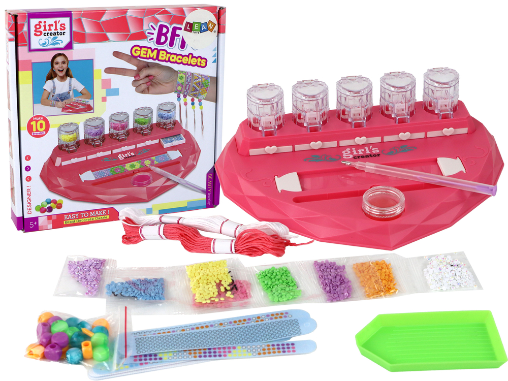 Dwie muliny, jedna różowa i druga biała, pozwalają na dostosowanie bransoletek do własnych upodobań i stylizacji. Dodatkowo, w zestawie znajduje się 5 pojemników na diamenciki i koraliki, co pomaga w organizacji i przechowywaniu materiałów. Wszystko jest zawsze pod ręką, dzięki czemu tworzenie staje się jeszcze bardziej przyjemne.