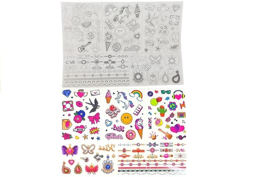 Zestaw Wodnych Tatuaży składa się z niewielkiego przybornika z lusterkiem, stempelka do nawilżania tatuaży oraz arkusza z uroczymi wzorami. Wśród wzorów można znaleźć zwierzątka, serduszka lub biżuterię. Wzór należy wyciąć i umieścić na skórze, następnie nawilżyć zgodnie z instrukcją dołączoną do zestawu. Już po kilkunastu sekundach tatuaż będzie gotowy!