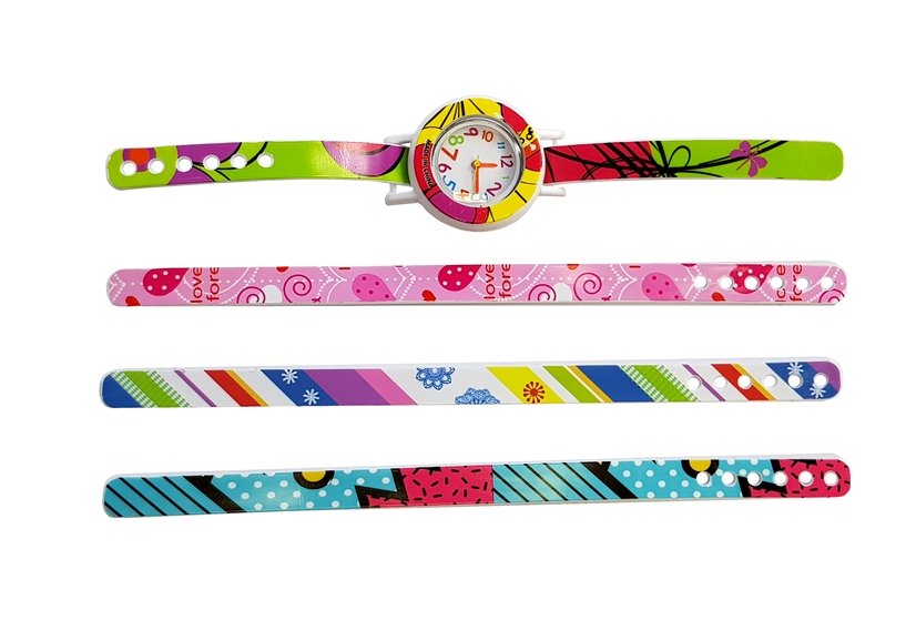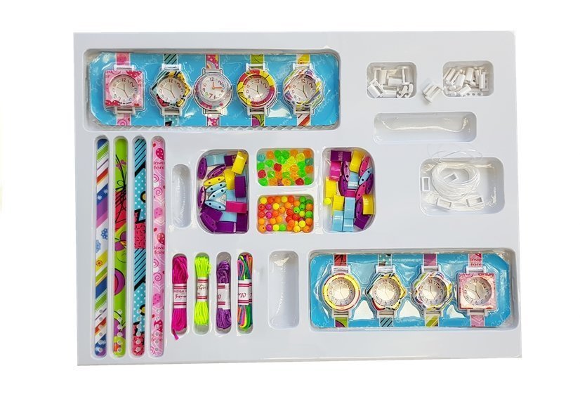 Wszelkie elementy zestawu do robienia zegarków dostosowane są rozmiarem do rąk małych dziewczynek. Paski wykonane są z miękkiego materiału łączącego właściwości gumy i silikonu, a ramki zegarków z wytrzymałego, solidnego plastiku. Różne kształty i kolory regulowanych pasków oraz ramek zegarków w połączeniu z akcesoriami typu koraliczki i rzemyki sprawią, że ilość kombinacji będzie nieograniczona.