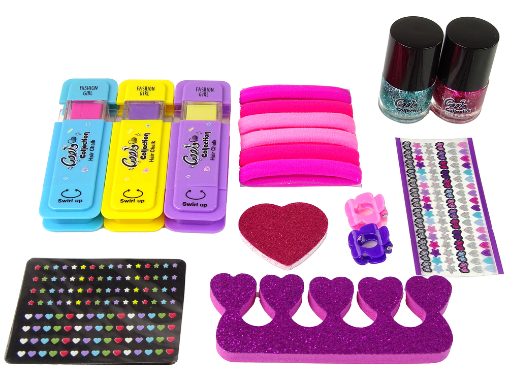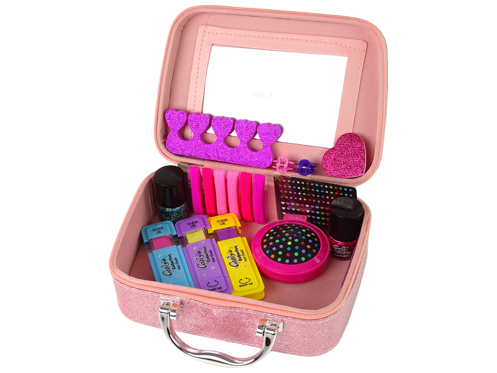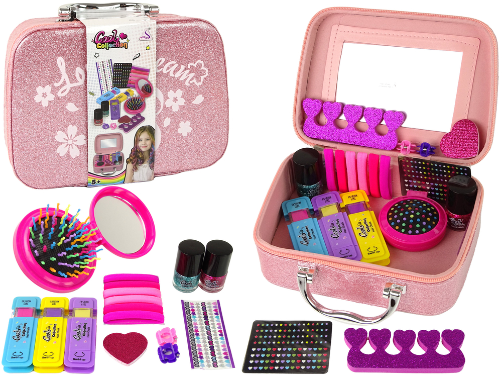 Zapraszamy do odkrycia naszego uroczego zestawu piękności, który przywoła uśmiech na twarzy każdej miłośniczki zdobień włosów i paznokci. Ta różowa brokatowa szkatułka jest przyjemna w dotyku i kryje w sobie wiele magicznych elementów.