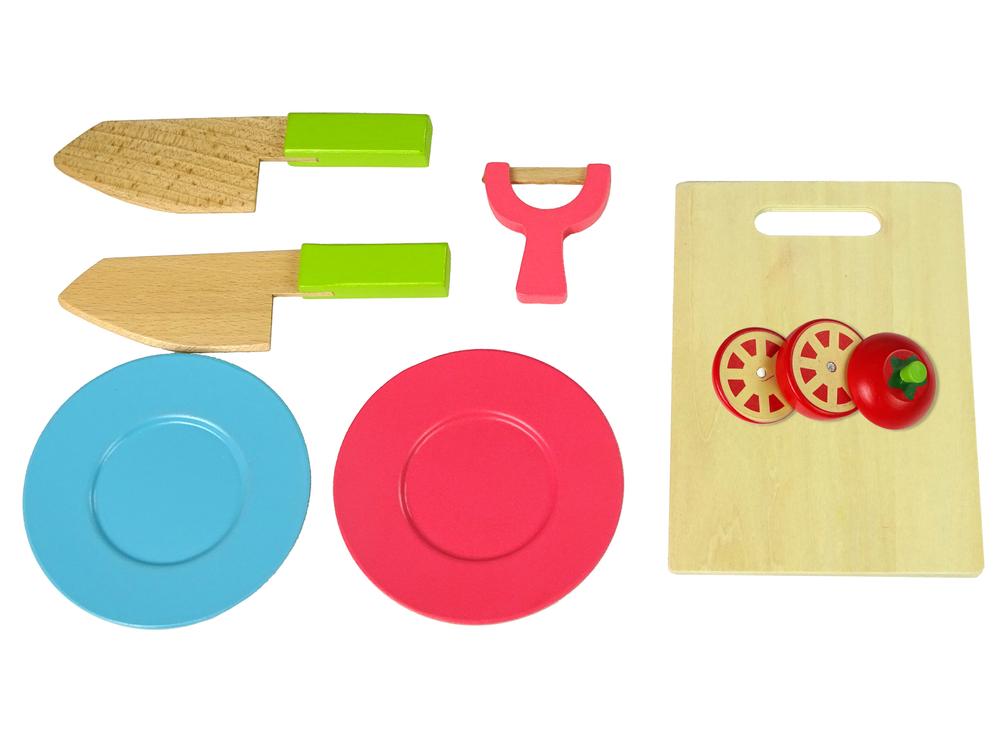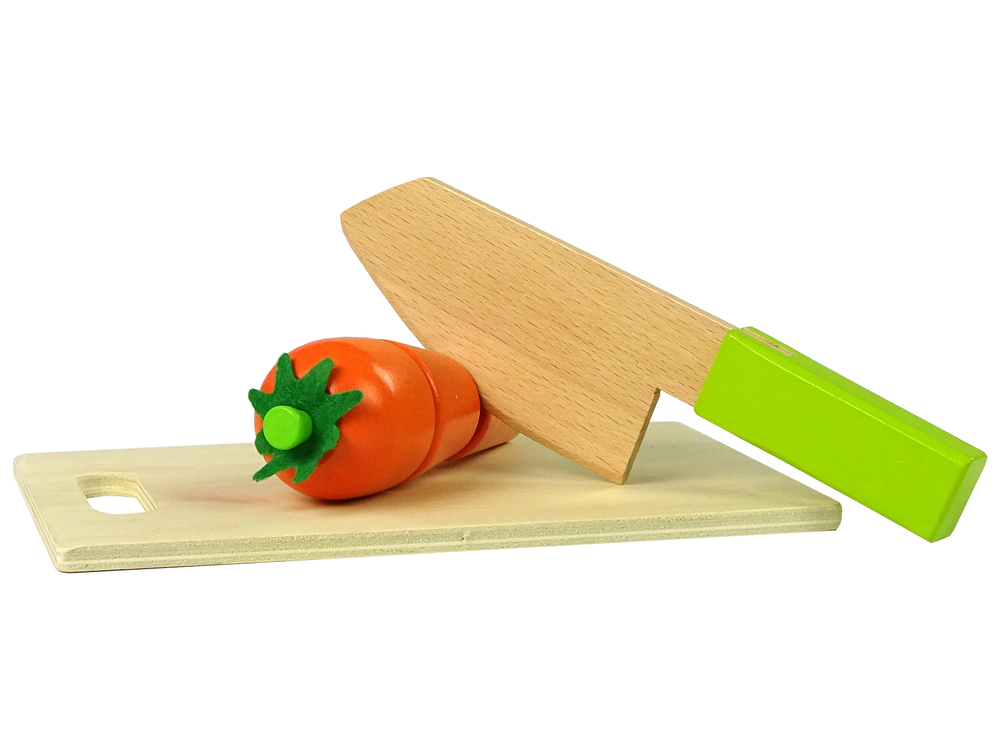 Owoce i warzywa przyczepione są do siebie magnesem, dlatego łatwo można je pokroić, a potem złączyć je razem. Dopasowywanie odpowiednich połówek zwiększy umiejętności logicznego myślenia. Aby dziecko mogło przygotować owoce, deseczka do krojenia pozwoli przekroić je na połówki, dołączonym do zestawu nożykiem.