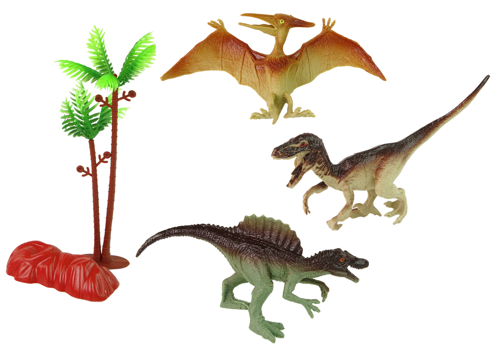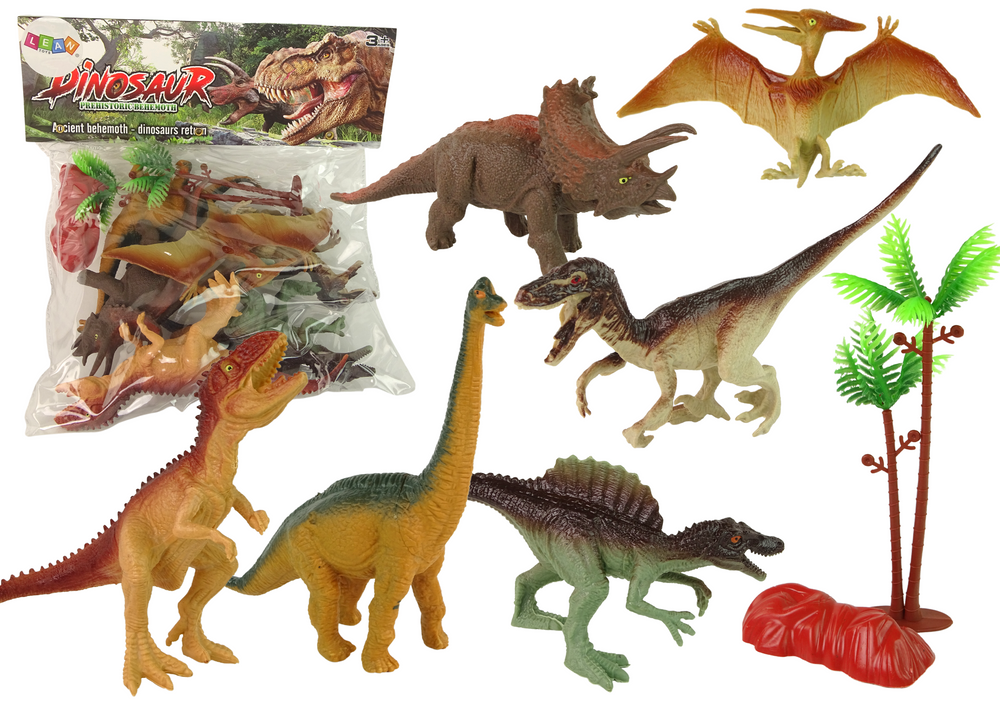 To doskonały zestaw dla małych miłośników dinozaurów. Zawiera on 6 realistycznych figurek, które reprezentują różne gatunki prehistorycznych stworzeń, takie jak: Pteranodon, Carnotaurus, Spinozaur, Apatozaur, Welociraptor oraz Triceratops. Każdy z nich ma inną wielkość i kolor, co pozwala dzieciom na tworzenie różnorodnych scenariuszy i sytuacji.