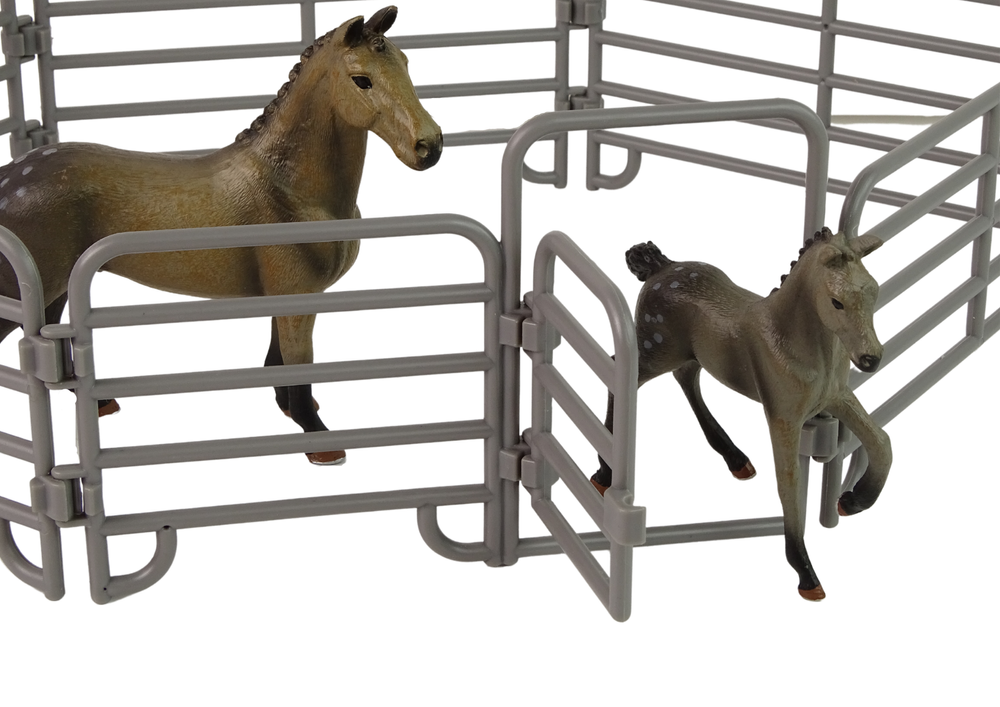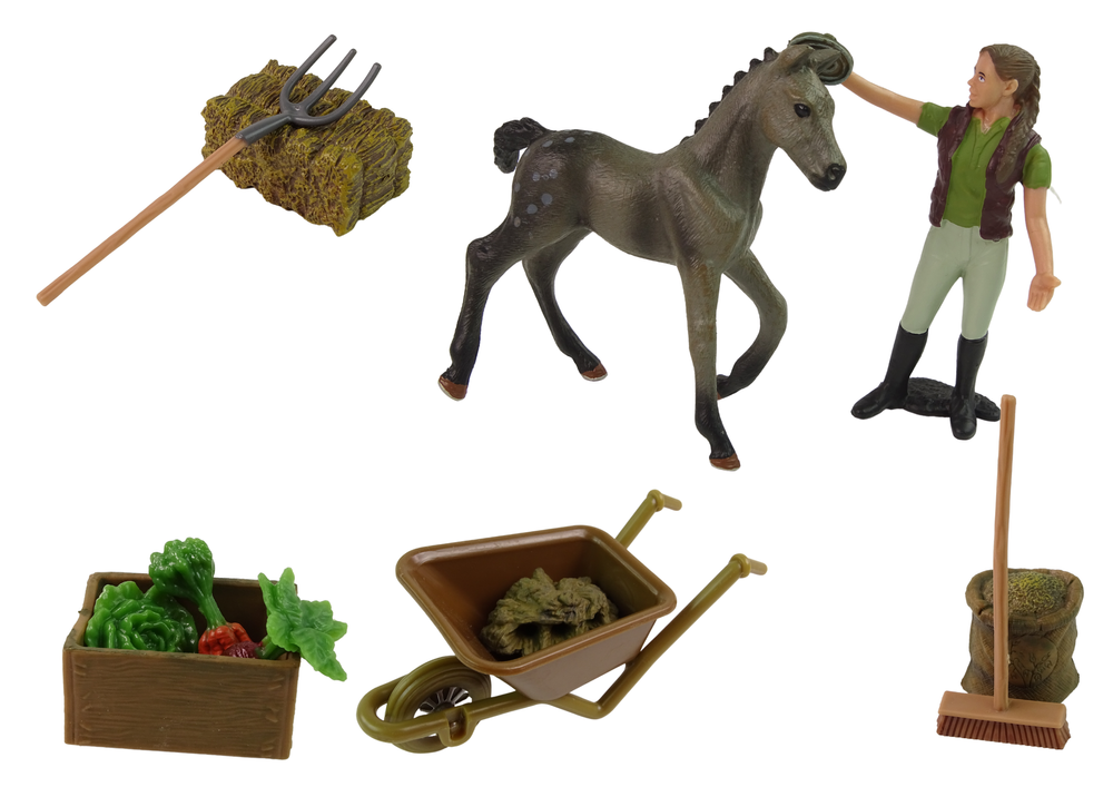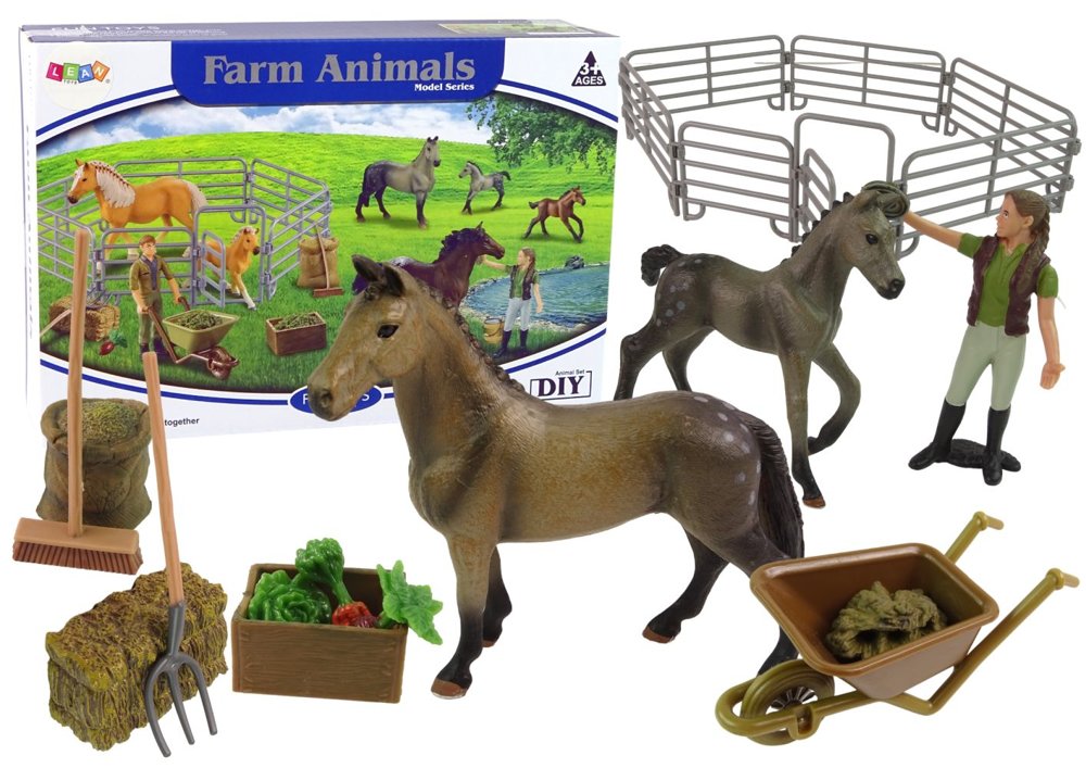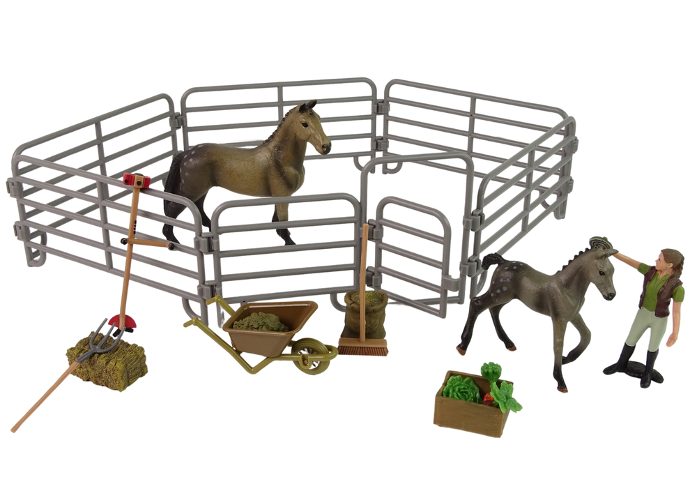 Taczka pozwoli na przewożenie narzędzi i potrzebnych rzeczy na farmie z miejsca na miejsce. Narzędzia takie jak miotła, czy widły przydadzą się, aby uporządkować zagrodę. Zagroda pomieści dużego szarego konia ze źrebakiem i pozwoli na odpowiednie opiekowanie się nimi za pomocą specjalnych poideł i pokarmów- marchewki i siana, załączonych do zestawu. W środku opiekunowie mogą szkolić swoje konie.