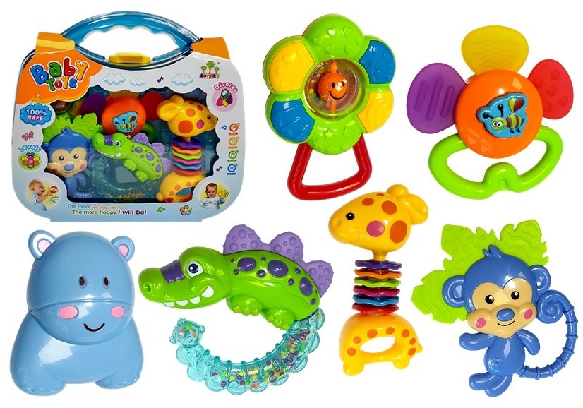 Grzechotki są to jedne z najlepszych nauczycieli dla małych odkrywców. Rozwija jedne z podstawowych umiejętności takich jak: rozpoznawanie dźwięków i kształtów, koordynacja ręka – oko, poprawi zmysł wzroku i słuchu. Zabawki przyciągają także swoimi wesołymi kształtami i barwną kolorystyką. Na pewno twój maluch wybierze spośród 6 grzechotek jedną z ulubionych. Do wyboru mamy krokodyla, małpkę, żyrafę, kwiatuszek, hipopotam lub pszczółkę. Każde ma przyjazną buzie, dzięki czemu twoje dziecko nie wystraszy się wręcz przeciwnie sprawi mu to radość. Niektóre z grzechotek posiadają gumowe dodatki, które służą jak gryzak przydatne przy ząbkowaniu u dziecka. Zabawki zapakowane są w przezroczystej walizce.