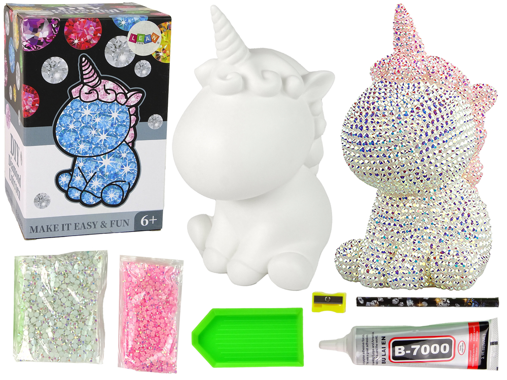 W zestawie znajdziemy specjalną podkładkę na której umieszczane są kryształki, dwa kolory udekorują małego jednorożca w dowolny sposób. Specjalny klej stworzy powierzchnię figurki klejącą, dzięki czemu diamenciki będą się trzymać. Układaj jeden po drugim, a oczom ukaże się piękna figurka! Ozdobi Twój pokój !