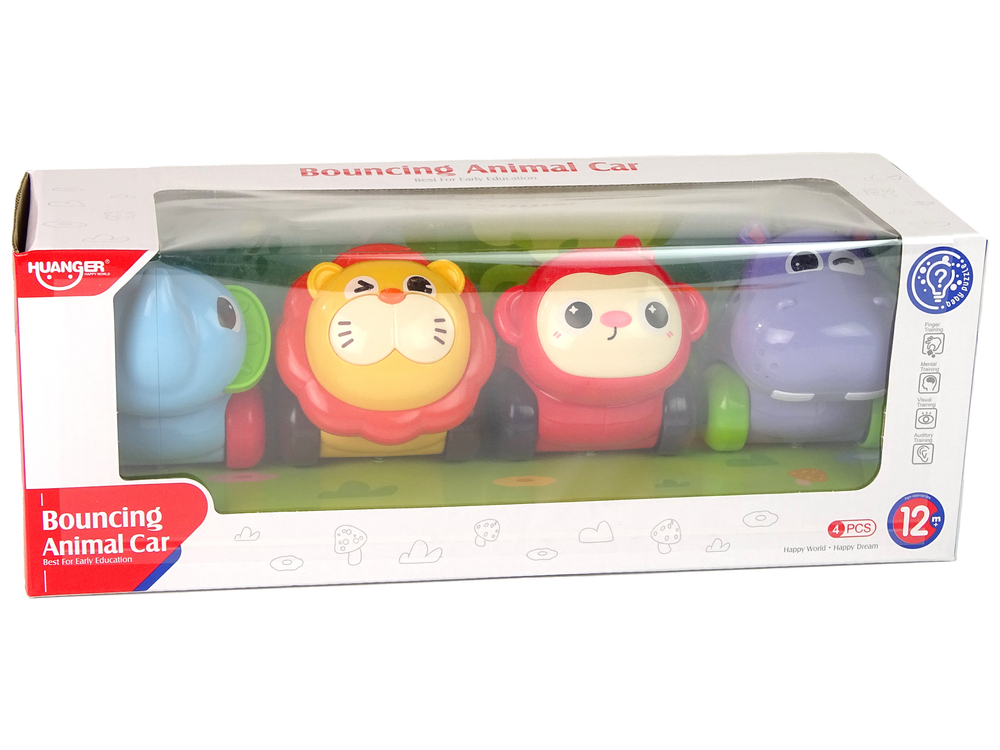 Zestaw składa się z czterech różnokolorowych pojazdów w kształcie zwierzątek, w tym: hipopotam, lew, słoń i małpka. Każdy z nich wypełniony jest małymi, kolorowymi kuleczkami, które podczas jazdy wirują, co daje świetne efekty wizualne zachęcające do zabawy. Pojazdy wykonane są z wytrzymałego tworzywa sztucznego, jakim jest plastik. Każdy samochodzik w kształcie zwierzątka ma unikalny kolor, i wzór, co zachęca również do rozwijania wyobraźni i kreatywności podczas zabawy.