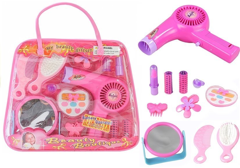 Suszarka do włosów zasilana jest 1 sztuką baterii AA 1,5 V, która nie jest dołączona do zestawu. Po umieszczeniu w niej baterii i włączeniu przycisku zabawka suszy włosy bardzo lekkim strumieniem powietrza, wydając przy tym charakterystyczny dźwięk. Zestaw wykonany jest z solidnego, trwałego materiału, jakim jest plastik. Konstrukcja zabawek pozbawiona jest ostrych, niebezpiecznych zakończeń, mimo to doskonale naśladuje wygląd prawdziwych przedmiotów. Wszelkie elementy znajdują się w przeźroczystej torbie, która posiada suwak i rączkę, ułatwiające przenoszenie zabawki. Zestaw posiada certyfikat bezpieczeństwa CE, przeznaczony jest dla dziewczynek powyżej 3. roku życia.