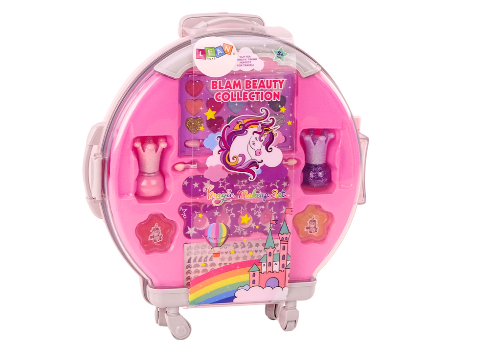Zestaw do makijażu i zdobień paznokci dla dzieci, zapakowany jest w uroczą, różową walizkę z kółkami oraz z wygodną rączką do trzymania, która sprawia, że jest jak prawdziwa walizka, idealna do podróży.
