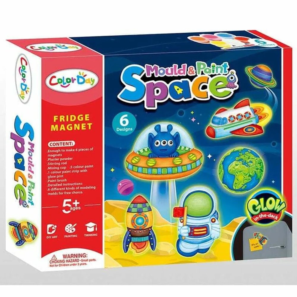 Zestaw pozwala na samodzielne stworzenie gipsów poprzez dołączony do zestawu proszek gipsowy. Foremki mają wzory pojazdów, planet, ufoludka i kosmity. Zostaje pomalowanie je farbami w 6 kolorach: pomarańczowym, różowym, zielonym- neon, niebieskim, żółtym oraz czerwonym. Mały pędzelek pozwoli na dokładne pomalowanie ozdoby, a dołączone do zestawu magnesy, na zawieszenie pięknych odlewów na lodówkę bądź w pokoju. Po zgaszeniu światła- niespodzianka! Odlewy świecą w ciemności. Podczas zabawy maluch może przenieść się w świat kosmosu i ufoludków.