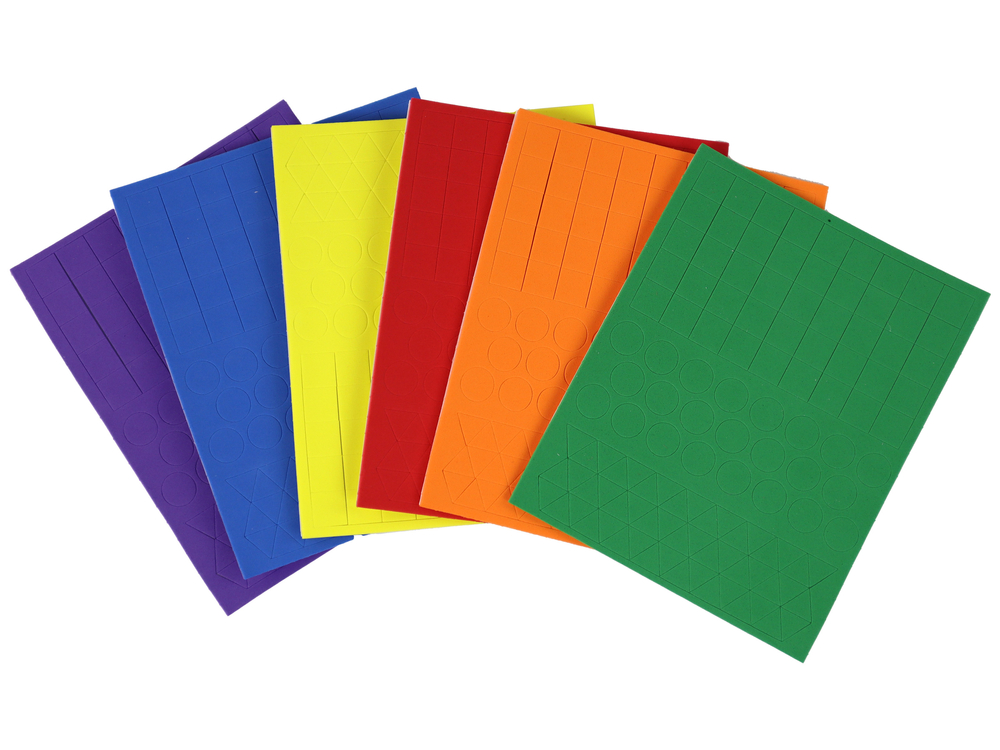 Do zestawu dołączone są samoprzylepne figury geometryczne w różnych kolorach: żółtym, czerwonym, niebieskim, fioletowym, pomarańczowym i zielonym. Każda figura geometryczna ma przypisaną konkretną pozycję na obrazku oraz określony kolor, co ułatwia dziecku wklejanie i tworzenie kompozycji.