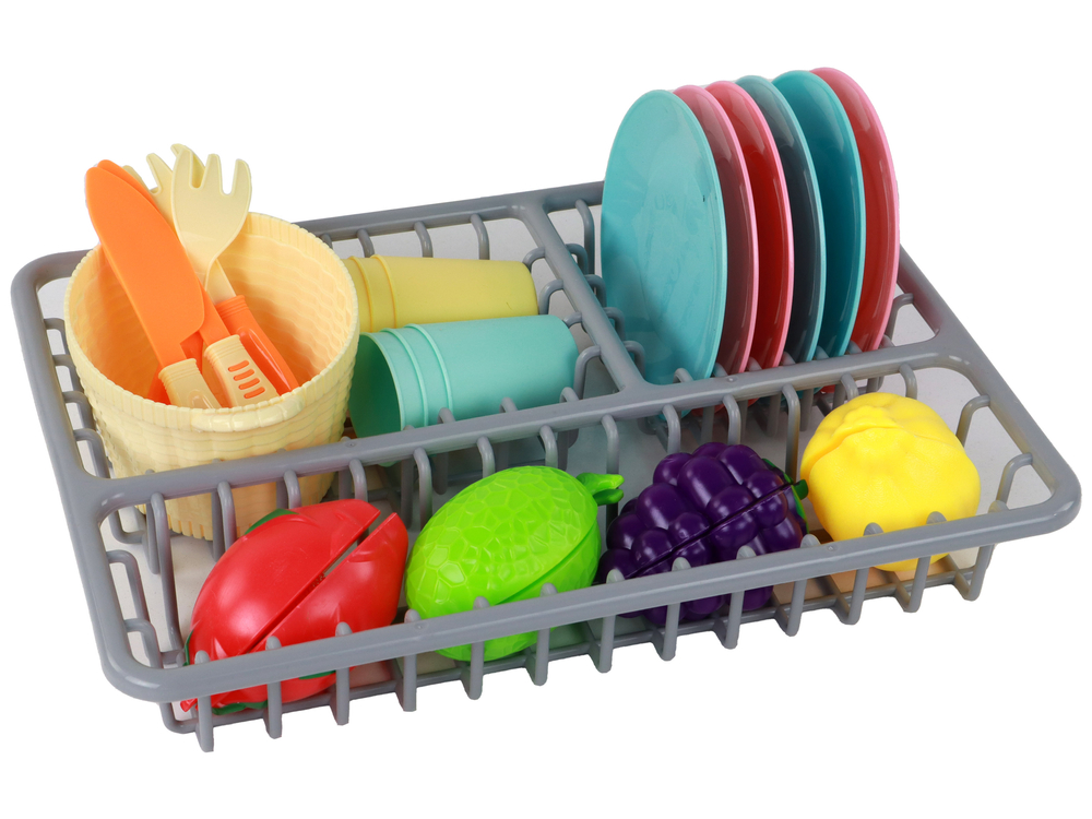 W skład zestawu wchodzi szara suszarka do naczyń o wymiarach 29,5 cm x 22 cm x 5 cm. Wewnątrz suszarki znajdują się trzy niebieskie talerze, trzy różowe talerze oraz trzy niebieskie i trzy żółte kubeczki. Dodatkowo, zestaw zawiera uroczy koszyczek z sztućcami, w tym dwoma nożami i dwoma widelcami.
