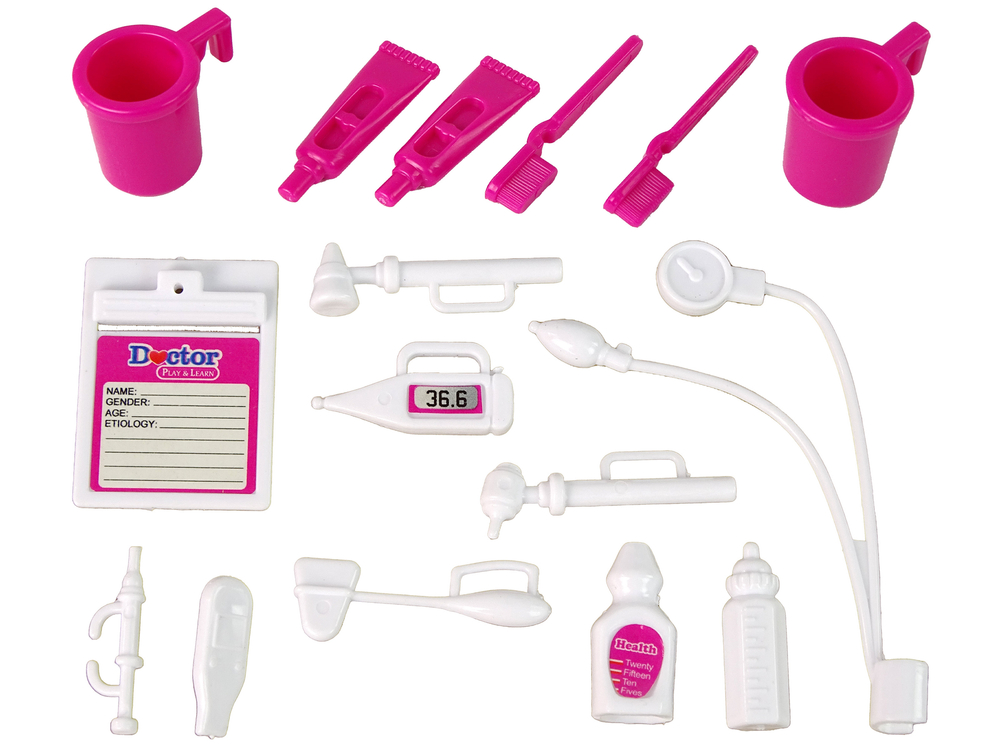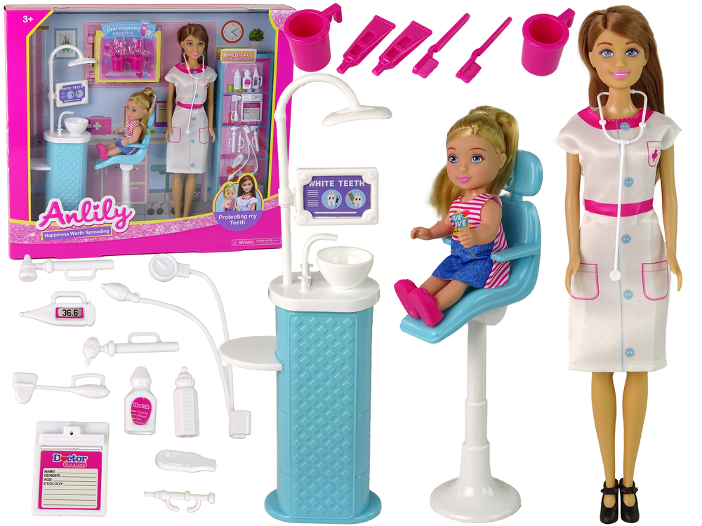 Zestaw posiada wszystkie elementy, które stworzą cały gabinet stomatologiczny. Dentystka ubrana jest w biały fartuch, ma stetoskop, co oddaje realizm. Fotel dentystyczny z unitem stomatologiczny to podstawa wyposażenia każdego gabinetu. Wszystkie akcesoria dodatkowe pozwolą na wykonanie badania i sprawdzenia, w jakiej kondycją są zęby naszej małej lalki. Wszystkie spostrzeżenia można zapisać na małej karcie pacjenta oraz po wizycie dać odpowiednią szczoteczkę i pastę.