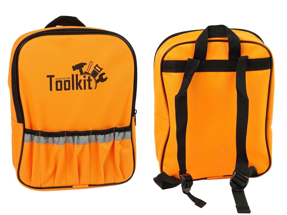 Plecak posiada zewnętrzne kieszenie na odpowiednie elementy zestawu, dzięki temu wszystko, co najbardziej potrzebne mały majster znajdzie pod ręką. Dzięki plecakowi zawsze po skończonej pracy będzie można schować je na swoim miejscu oraz bez problemu przenieść z miejsca na miejsce. Torba posiada regulowany pasek, dzięki czemu można dostosować długość paska do wzrostu dziecka.