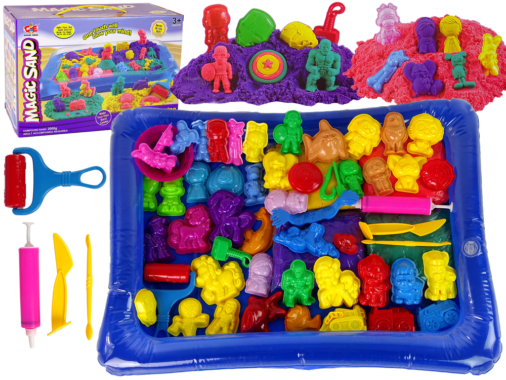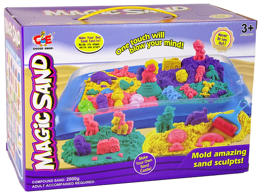 – 4 kolorów piasku kinetycznego: żółty, zielony, pomarańczowy, jasny brązowy, czerwony, niebieski