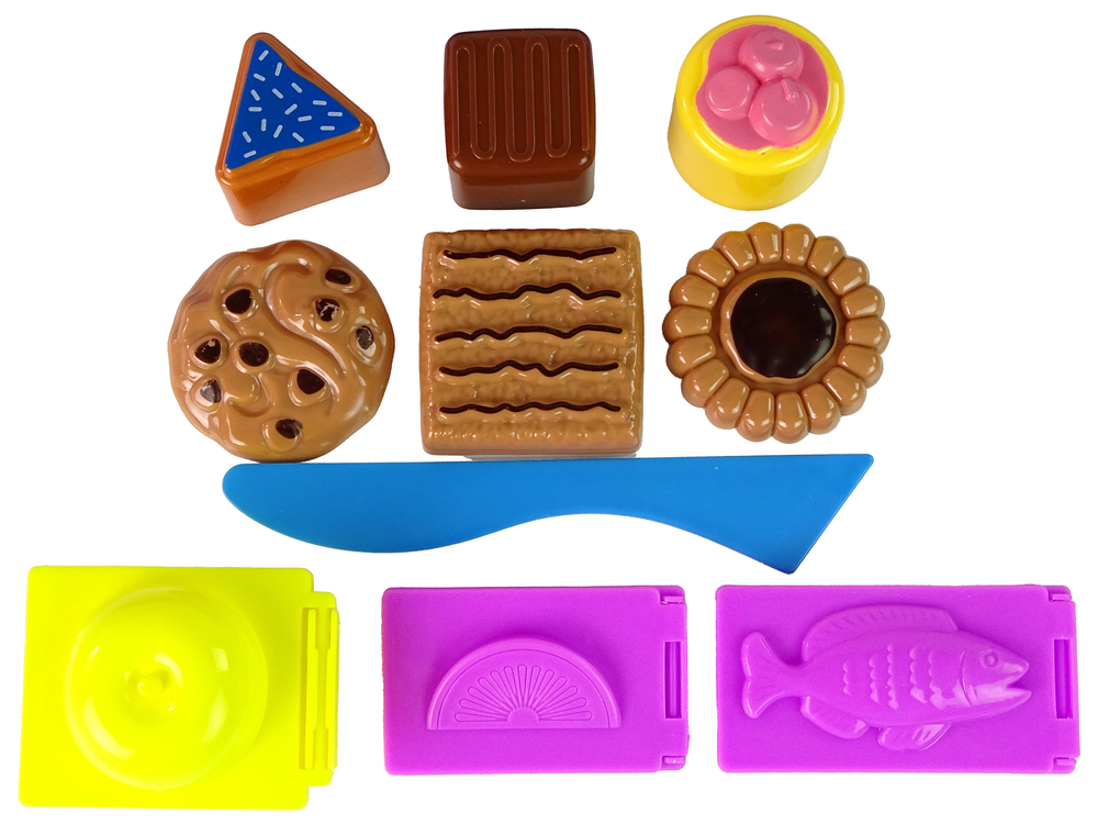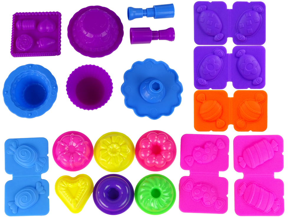 Zestaw zawiera formy różnych potraw, lizaków, przyborów kuchennych i talerzyków. Foremki są wykonane z trwałych i bezpiecznych materiałów, dzięki czemu są odpowiednie dla dzieci.
