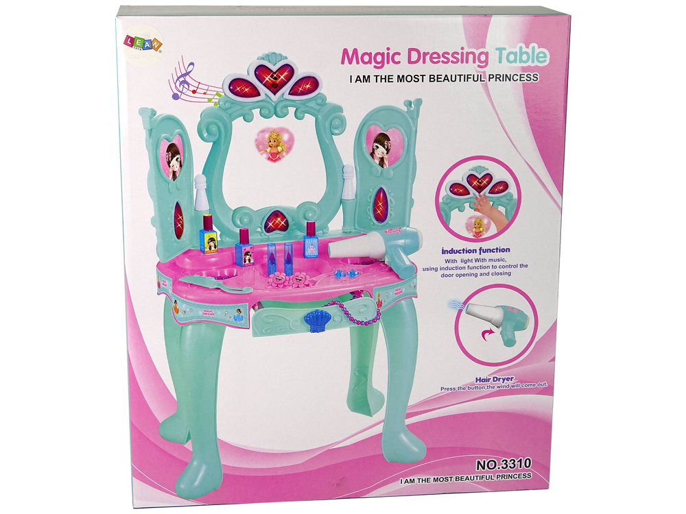 Po dotknięciu przycisku w kształcie serca znajdującego się nad lustrem, zacznie grać przyjazna melodia, a twarz dziecka zostanie oświetlona. Razem z dźwiękiem i światłem, toaletka zacznie się otwierać, ukazując lustro.